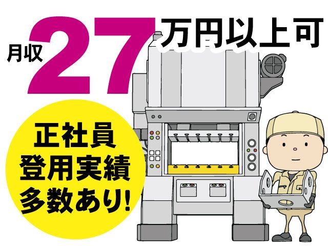 仕事内容 \正社員登用実績多数あり!/ 月収27万円以上可! 自動車部品の製造業務です! メインのお仕事はプレス機のボタン操作になります。 工場見学可能なので、 一度見学に来てみてください! 正社員を目指す20代・30代の男性活躍中! 日勤のみ・土日祝休み! 残業多めで稼げます! 確実な正社員登用を目指せる環境です。 「将来に向けスキルアップしたい方」 におすすめです。 「安定」「働きやすさ」「カンタン作業」 全部そろった人気のお仕事です。 まずは職場見学だけでもOK! 【お仕事内容】 自動車部品の製造を行っている会社でのお仕事になります。 取扱う製品は長さ6センチ程度の「手のひらサイズ」の金属製品です。 製造機械のボタン操作や、完成製品の目視検査をお願いします。 【具体的な内容】 (1)ボチッとボタンを押すだけ。簡単機械作業 運転スイッチのon/off、自動運転に切り替えるスイッチを 押せば操作完了。 長年の知識や勘は必要なし! 手順通りに機械を操作していただきます。 (2)完成製品のバリや欠けの検査作業 バリとは…? 機械で加工した時に出る出っ張りやギザギザの事。 完成製品に傷やバリがないかをしっかり確認する 簡単な目視検査作業です! (3)金型の交換作業 3日に1回のペースで機械の金型交換をお願いいたします。 金型って重そう…。 専用の台車を使って動かすだけなので、 負担無くお仕事可能です! 【働きやすい勤務スタイル】 ・日勤のみで働きやすい ・残業多めで稼げる ・土日祝休み ・長期休暇あり(GW・夏季・年末年始) ・車通勤可、バイク通勤可 ・無料駐車場完備 ・出張面接あり ・職場見学可 ・昇給あり ・即入社可 【勤務地について】 日光市大室 無料駐車場完備 車通勤・バイク・自転車通勤可 最寄り駅:JR日光 下野大沢駅 【応募方法について】 WEB応募よりエントリーください 24時間受付中です お電話でのご相談、 お問い合わせもお気軽に! TEL.0287-40-0515(受付/9:00~17:30) ~エントリー後の基本スケジュール~ (1)弊社よりご連絡 (2)ご来社もしくはWEB面談(専属スタッフとの面談) (3)お仕事案件のご案内 (4)面接設定 (5)就業決定