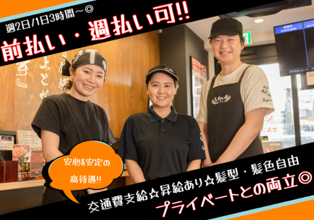 アピールメッセージ 【給与即払い可】高待遇盛り沢山のすた丼屋スタッフ♪扶養内勤務・短時間勤務◎ 安心&安定の高待遇!!⇒高時給☆交通費支給☆昇給有☆髪型・髪色自由☆給与即払い可