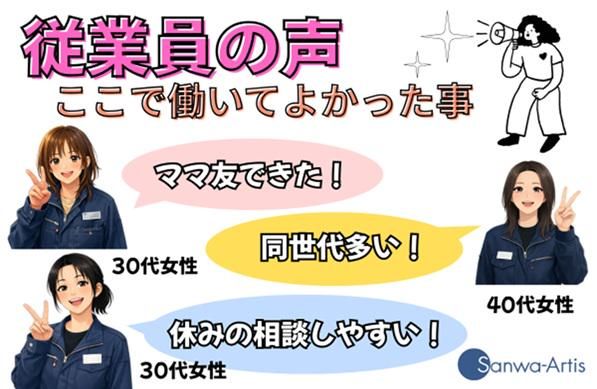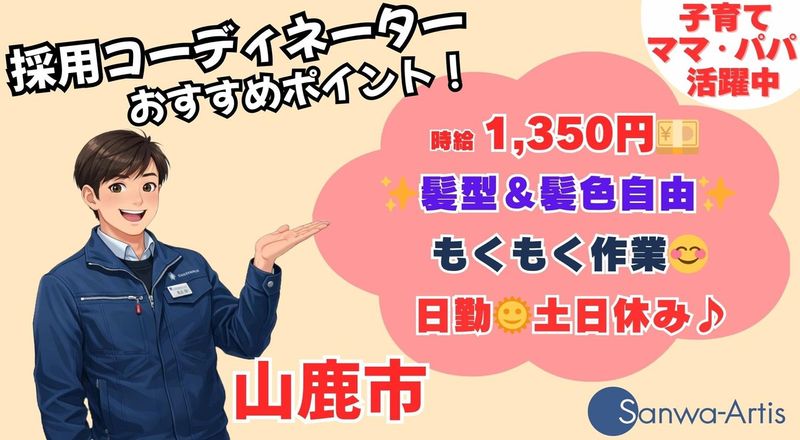 仕事内容 あなたのライフスタイルにあわせた お仕事みつけませんか 【求人コーディネーターよりごあいさつ】  ̄ ̄V ̄ ̄ ̄ ̄ ̄ ̄ ̄ ̄ ̄ ̄ ̄ ̄ ̄ ̄ ̄ ̄ サンワの求人をご覧いただき、 ありがとうございます。 私たちは 『共に学び、共に生長する』 という企業理念のもと、 すべての方により添うことを 大切にしています。 本日は最後までみていただけると うれしいです。 お仕事のあいまで見てくださってる方は 右下の『保存ボタン』で後からじっくり♪ 【採用コーディネーターより】  ̄ ̄V ̄ ̄ ̄ ̄ ̄ ̄ ̄ ̄ ̄ ̄ ̄ ̄ ̄ ̄ ̄ ̄ ✨「カンタン」&「モクモク」軽作業♪ ✨未経験者さん大歓迎(*'▽') ✨自分らしさ全開でOK! 髪型・髪色自由♪ 製造業や工場が未経験の方も大歓迎! 【お仕事内容】  ̄ ̄V ̄ ̄ ̄ ̄ ̄ ̄ ̄ ̄ ̄ ̄ ̄ ̄ ̄ ̄ ̄ ̄ 手の平サイズの小さな部品を 工具を使い、図面やマニュアルを見て 組立・調整・検査などを行います。 ✅組立 └ドライバーを使用してのネジ締め ✅調整 └顕微鏡を使用してチェック 機械を使用しての動作確認 ✅検査 └細かい傷や汚れを目視でチェック! ✅梱包 └検査が終わった製品を丁寧に箱詰め 上記工程で完了! ※いずれも立ち作業になります 資格はいりません(*'▽'*) 【「覚えやすさ」が自慢!】  ̄ ̄V ̄ ̄ ̄ ̄ ̄ ̄ ̄ ̄ ̄ ̄ ̄ ̄ ̄ ̄ ̄ ̄ ✨業界未経験者さんでも始めやすい 作業はシンプルで、 複雑な工程はありません。 入社後には丁寧な教育期間があるため、 工場ワークが初めての方も安心スタート! 【アピールポイント】  ̄ ̄V ̄ ̄ ̄ ̄ ̄ ̄ ̄ ̄ ̄ ̄ ̄ ̄ ̄ ̄ ̄ ̄ ✨研修制度が充実 安心して働ける環境です。 ✨業績好調の安定企業 長く腰を据えて働きたい方にぴったりの 将来性ある職場です。 【こんな方におすすめ】  ̄ ̄V ̄ ̄ ̄ ̄ ̄ ̄ ̄ ̄ ̄ ̄ ̄ ̄ ̄ ̄ ̄ ̄ ✨オシャレを我慢したくない方 髪型・髪色自由(金髪もOK!) ✨土日はしっかり休みたい方 長期休暇もあり、 オンとオフの切り替えがバッチリです。 ✨20代~50代が活躍する職場で、 仲間と一緒に楽しく働きたい方。 【職場見学・選考フロー】  ̄ ̄V ̄ ̄ ̄ ̄ ̄ ̄ ̄ ̄ ̄ ̄ ̄ ̄ ̄ ̄ ̄ ̄ ✨職場見学できます(完全予約制)! 「実際の作業の様子は?」 「休憩室の雰囲気は?」など 気になる点は事前にチェックして 納得してから決められます。 ご応募・お問い合わせ (オンライン面談も随時受付中!) ↓ 詳細案内・お仕事相談 ↓ 職場見学 (私たちが同行してご案内します) ↓ 内定・お仕事スタート!