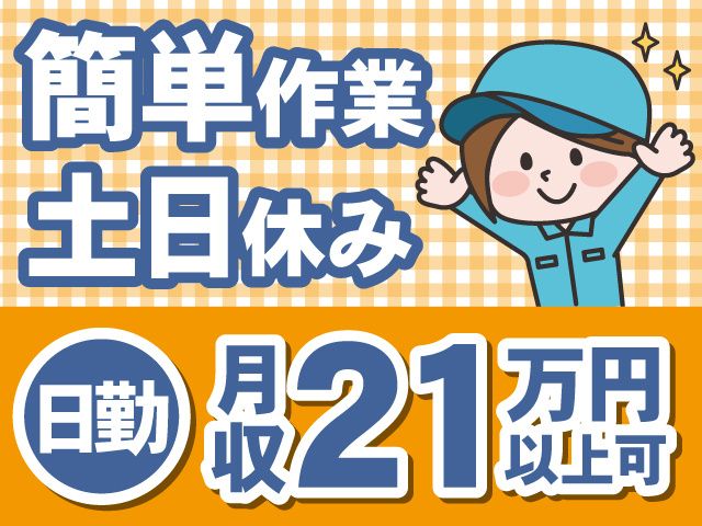 仕事内容 人気の日勤&土日休み!年間休日120日! 材料をセットしスイッチを押すだけのカンタン作業! <オススメのポイント!> ・簡単作業で高収入!安定して働きたい方にオススメ! ・製造業の経験が活かせる ・働きやすい日勤帯!人気の土日休み! ・うれしい長期休暇あり! ・髪色自由!ネイルOK!自分らしく働けます。 <お仕事内容> プレス機を使用した金属加工のお仕事です。 小型の金属部品をプレス機にセットし、 決められた通りボタンを押すだけ! スタートボタンを押すと機械が自動で作業します! 加工が終わった製品は、後ろの棚に移動をお願いします。 作業はマニュアルに沿って進められるため、 初めての方でもすぐに慣れていただけます! 安全に作業が出来るように研修を実施し、 分かるまで丁寧に説明を行うので、定着率も抜群です! 未経験からスタートしたスタッフ多数活躍中! <このような方にオススメのお仕事> ・プライベートを重視されたい方 ・製造業の経験を活かして、シッカリと稼ぎたい方 ・安定した職場で安定した収入を得たい方 ・「派遣は初めて!」「アルバイトしか経験がない…」という方 ・製造業や軽作業に興味を持っている方も大歓迎! マシンオペレーターなど製造業が初めての方もご安心ください。 30代~50代の男性活躍中! <直接雇用制度あり> 長期でキャリアアップも可能! 今、働いているパート・アルバイトより収入を得たい方にもオススメです! <週払い&前払い制度あり> お給料日前や入職前も安心!お気軽にご相談ください。 <派遣が初めての方も安心!> 面接から入社・入社後まで、同じ担当者がサポートいたします。 働きたい時間帯や休日の希望など、ぜひお気軽にご相談ください。