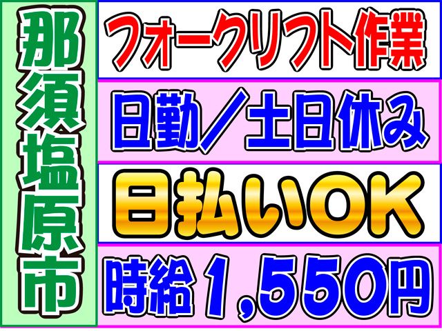 仕事内容 倉庫内でのフォークリフトを使った仕分け作業 〇ブランクのある方もOK 資格・経験を活かして働けるシンプル作業 働きやすい日勤のみ・土日祝休み 20代~60代の男性活躍中、長期安定 【倉庫内フォークリフトスタッフのポイント】 〇単純作業×もくもく作業 〇カウンターフォークリフトを使用します 〇フォークリフト資格・経験活かせます 〇重量物の手運びナシ 〇基本はフォークリフト操作がメイン 〇体の負担も少なめ 〇高時給1,550円~1,937円 〇日勤のみ 〇土日祝休み(会社カレンダー) 〇ブランクのある方もOK 〇20代30代40代50代60代の男性活躍中 〇日払いOK(規定内) 〇職場見学OK 〇履歴書不要 〇「マイリク定着支援」導入企業! 【倉庫内フォークリフトスタッフの仕事内容】 那須塩原市にある倉庫内にて、 カウンターフォークリフトを使った商品の運搬作業 基本はフォークリフト操作がメインなので、 体の負担も少なめです 少しでも気になったら お気軽にご応募ください 【勤務について】 〇日勤のみ(8時~17時) 〇土日祝休み(会社カレンダー) 急な発熱・体調不良・冠婚葬祭など、 突発的なお休みに柔軟に対応しております。 【経験活かせます!】 〇フォークリフト派遣社員 〇リーチフォーク作業派遣社員 〇倉庫内作業パート・アルバイト 〇出荷作業パート・アルバイト 〇積み込み作業パート・アルバイト 〇ピッキングパート・アルバイト ブランクある方もOKです! 倉庫内でのフォークリフトや 運搬などの経験を活かして働けます! ご不明な点はお気軽にお問い合わせください。 お電話でのご応募も受付中! 株式会社ロフティー 小山支店 TEL0800-222-6888(フリーダイヤル) 採用担当まで お仕事情報などはこちら https://entori.jp/lofty-oyama コーディネーター・定着支援のWサポート体制導入 「マイリク定着支援」導入企業! アンケートで職場の様子を確認し、 コーディネーター・定着支援担当が連携してサポート。 はじめての派遣でも安心して働けるよう迅速かつ 丁寧にサポート対応いたします。