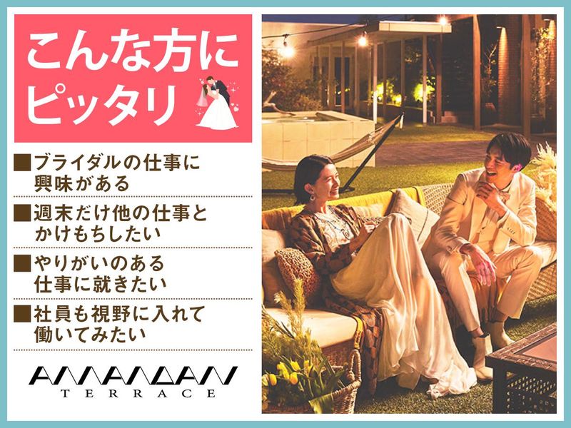仕事内容 *水に浮かぶように造られた チャペルがある結婚式場* 感動いっぱいの結婚式を一緒にサポート♪ 週1~の柔軟シフトでWワーク・副業OK! 学生・フリーター・社会人さんも活躍中♪ アマンダンテラスは 名古屋市内を望む高台のロケーションと 自然が融合したモダン邸宅な結婚式場。 ウェディングのお手伝いをするお仕事です◎ <主なお仕事内容は…> 結婚式場スタッフとして 次のお仕事をお任せ! 【サービススタッフ】 ■会場の準備 ■お客様の上着や荷物のお預かり ■お席のご案内 ■結婚式のお料理・ドリンク提供 【洗い場スタッフ】 ■洗い場での洗い物作業 ■仕込みの手伝い ■オープン準備 ■備品・お皿の準備 など ※キッチン業務はありません◎ ―――――――――――――――― フリーター・社会人・学生さんに オススメのポイントはこちら★★ ―――――――――――――――― ・週1日~1日4時間~OKで融通◎ ・本業が休みの土日だけ等大歓迎! ・かけもち・副業OK! ・絶品のまかないアリ(^^) まかないは本格料理人たちが 美味しい食材を使って作ってくれます♪♪ ―――――――――――――――― 特別な1日をサポートするお仕事 具体的な仕事の流れは? ―――――――――――――――― ▶STEP.1 ミーティング 披露宴の流れやお料理について スタッフ間で事前に確認して 式中にバタバタしないようにします◎ ▶▶STEP.2 披露宴会場の準備 お席に置く名札や ゲストの方に渡す引き出物を確認したり グラスを磨いたりして準備します。 ▶▶▶STEP.3 お客さまのお出迎え 荷物をお預かりし、 待合室でドリンクをお出しします! ▶▶▶▶STEP.4 ホール業務 お席にご案内し、順番にお料理や ドリンクを提供します◎ ―――――――――――――――― 未経験者歓迎! みんなで助け合う雰囲気です ―――――――――――――――― 最初は結婚式の見学からスタート! 見学後は本番じゃないところで、 研修を実施します◎ 「ブランクがあって不安…」 「働くこと自体久しぶり…」 そんな方もご安心ください。 不安がなくなるまで、 スタッフ全員でサポートします◎