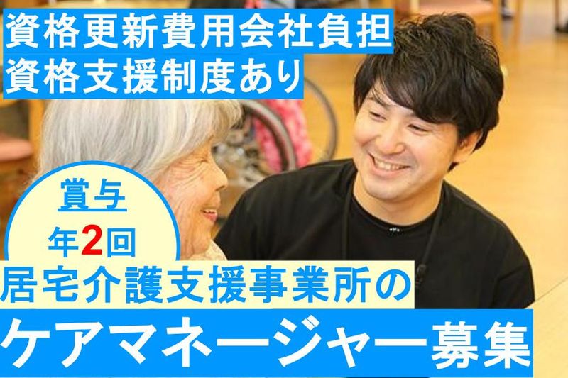 【アピールポイント】 居宅介護支援事業所でのケアマネジャー募集! ●賞与年2回 ●資格支援制度あり ●ケアマネ資格更新費用会社負担! ●ブランクOK