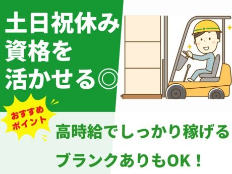 仕事内容 【仕事内容】 \高時給1,400円×日勤×土日祝休み/ ◎──────────────────────────◎ 加東市の新倉庫でフォークリフト作業♪ 広い通路で運転しやすく、働きやすい環境! ブランクがある方も安心して働けます! ◎──────────────────────────◎ 《給湯器を扱うフォークリフト作業》 ◇仕事内容 給湯器を扱う大手企業の新しい倉庫です。 主にフォークリフトでの運搬業務をお任せします。 ・給湯器をパレットに乗せる作業 ・倉庫内の入庫・出庫作業 ・パレットの移動や整理など荷役業務 広い通路での作業なので、運転がしやすい環境。 フォークリフト資格を活かせるお仕事です。 トイレなどの小休憩も自由で、自分のペースで働けます。 ◇この仕事の魅力 ・高時給1,400円でしっかり稼げる! ・日勤専属×土日祝休みで予定も立てやすい♪ ・制服一式貸与で準備不要! ・更衣室・個人ロッカー・休憩室完備◎ ・マイカー・バイク通勤OK! ◇作業環境 ・20代~50代の幅広い年代が活躍中! ・派遣社員が多く、働きやすい雰囲気です♪ ・業務に慣れるまで丁寧にサポートします! 派遣が初めての方も、しっかりフォローします! 安心してご応募ください♪ (雇入れ直後)上記のとおり (変更の範囲)会社の定める業務 【アピールポイント】 [加東市]給湯器を扱う新しい倉庫でフォークリフト作業/ブランクOK!/高時給1,400円/日勤専属/土日祝休み 【こんな方にオススメ】 ・セカンドキャリアとしてのお仕事をお探しの方 ・フォークリフト免許をお持ちの方 ・高収入・高時給のお仕事をお探しの方 ・商品検品・仕分け・ピッキングなどの倉庫内作業の経験を活かしたい方 ・梱包・包装・組立・加工などの工場製造の経験を活かしたい方 ・検査・充填・品出しなどの機械オペレータの経験を活かしたい方 ・食品工場(肉・鮮魚・野菜・惣菜)での盛り付け・調理・材料カットの経験を活かしたい方 ・経験が浅いけどスキルアップしていきたい方 ・力仕事に抵抗のない方 ・寮完備や送迎があるお仕事を探している方