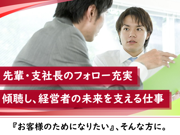 求めている人材 【必須条件】 ◎高卒以上 ◎基本的なPCスキルをお持ちの方 ◎普通運転自動車免許 ◎自家用車をお持ちで、業務に使用可能な方 ※ガソリン代・駐車上代等の走行諸経費は会社負担となります 【歓迎条件(必須ではございません)】 ◎営業・販売・接客などの 顧客折衝・対応経験をお持ちの方 ◎コールセンターなどで お客様とのコミュニケーションを 大切にされたご経験をお持ちの方 \\こんな方にはピッタリ// ☆お客様の役に立ちたいといった考えをお持ちの方 ☆社内外とのコミュニケーションがある仕事につきたい方 …代理店様、経営者様の営業支援にピッタリ! 話すことが上手くなくても大丈夫。お客様の話を傾聴することが大切です。 ☆自身の介在で価値を発揮することがやりがい方 …何気ない会話がきっかけでスイッチが入ることも ☆長く働ける環境で働きたい方 …平均勤続年数17.5年(当社全体) 30代・40代の女性社員が転職し、活躍している職場♪ 個人の尊重・フォロー体制◎・ワークライフバランス◎ といった働きやすい環境です♪