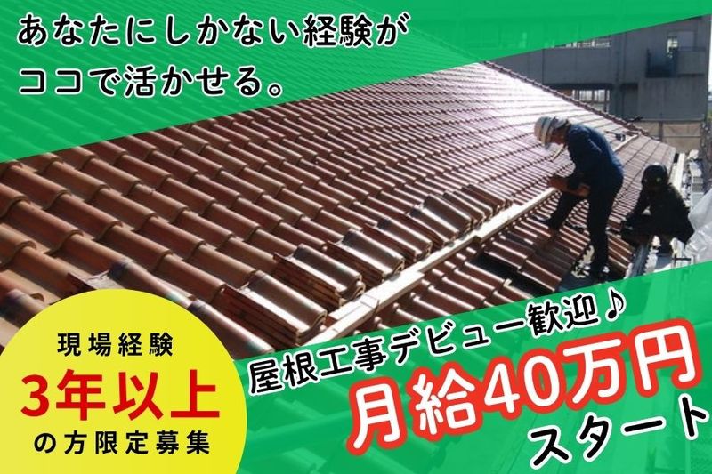 【仕事内容】 屋根工事のパイオニア企業として名高い弊社。 なりたい自分の実現に向けて、ぜひ一緒に働きませんか? 【安城ルーフで働くおすすめポイント】 ⭕️月給40万円スタートで安定した収入 ⭕️屋根工事のスペシャリストになれる ⭕️「なりたい自分」の自己実現が可能 ⏩️具体的な業務内容 外装・屋根・外壁の施工管理を行う現場作業の責任者を募集しています。 ・施工管理 ・現場作業(屋根、外壁、雨樋、板金) ・材料や工具管理 ・進捗確認 ・安全管理 ・営業業務(太陽光の発電システム施工など) ・ドローンにて撮影 現場責任者として従事したことがある方は、経験を活かしてご活躍いただけます。 =========== ✅月給40万円スタート =========== 現場経験を3年以上お持ちの方、月給40万円スタートです。 前職からさらにキャリアアップしたい、新しいことに挑戦したい。 そんな前向きなアナタの気持ちを全力でバックアップします! ぜひ一緒に成長しませんか? =========== ✅新しい事業に携われる =========== 弊社の使命は、屋根工事・外壁工事など建物外部の施工会社として、材料の持つ優れた機能や美しさを損なうことなく確かな施工をお客様にお届けすること。 地域密着型の施工会社として、今できることを全力で取り組んでいます。 また、屋根工事完成後にドローン撮影を実施しており、今後はドローン事業も展開していきたいと考えております。 新事業にも携われる環境で、先陣切ってご活躍ください! ============ ✅なりたい自分の実現へ ============ 「若いうちに手に職をつけたい」 「自分の会社を持ちたい」 「新しいことに挑戦したい」 安城ルーフは、そんな皆さんの前向きな気持ちを全力で応援・バックアップします。 弊社の自慢である「チームワーク」を活かしつつ、安心の教育・研修システムを完備。 一緒に【なりたい自分】を叶えていきませんか? 【求人ID-ANA】