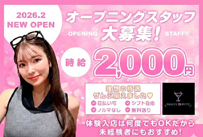 仕事内容: *:。.。o〇 *:。.。o〇 *:。.。o〇 *:。.。o〇 心斎橋ミナミの新オープンスナック♪ 23歳の優しくて可愛いママと一緒に アットホームな空間で楽しく勤務♪ *:。.。o〇 *:。.。o〇 *:。.。o〇 *:。.。o〇 2026年2月6日にオープンした 完全新規オープニングの スナックです♪ 「ナイトワークは初めて」 「キャバクラやガールズバーはちょっと…」 そんな方にこそオススメ! ノルマや出勤強制は一切なし。 気さくな常連さんと楽しく おしゃべりするだけの シンプルで働きやすいお仕事です♪ ✨この求人のポイント!✨ ✅日払いOK! ✅ドリンクバックあり! ✅各種手当あり! ✅ノルマなし!プレッシャーゼロ! ✅未経験の方も活躍中! ✅体験入店は何度でもOK! 【仕事内容】 簡単なアルコールを作って提供したり、 お客さんと楽しくお喋りするお仕事です♪