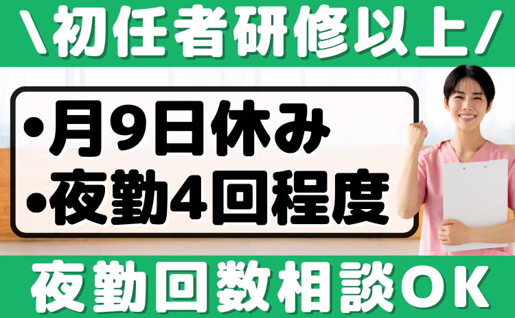 勤務時間 【日勤】 ①8:00~17:00 ②9:00~18:00 ③11:00~20:00 【夜勤】 16:30~翌9:30(休憩2h) ※夜勤は月4回程度(回数相談可)