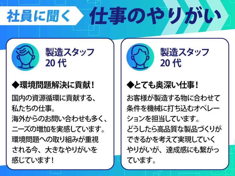 求めている人材 せっかくなら、未来の自分に誇れる仕事を。 社会の役に立つやりがいを感じたい方歓迎! 【製造未経験者歓迎】学歴不問・経験不問 【UIターン歓迎】地元で働きたい方もぜひ 【必須】 ✅フォークリフト免許(入社時必須) ✅明るくコミュニケーションを取り働ける方 ※※※フォークリフト免許について※※※ 業務上必要な資格のため、お持ちでない方は 入社までに取得していただきます。 *取得費用は自己負担(約4万6000円) *金額は教習所などにより異なります。 ※※※※※※※※※※※※※※※※※※※ <未経験スタッフ活躍中!経験不問> ◆社員の前職は・・・ 美容室/ハウスメーカーの営業/ スポーツジムのインストラクター/ スーパーやホームセンターの販売職など! 未経験でも問題なくスタート可能! ◆こんな経験も活かせます! 倉庫管理、フォークリフトオペレーター、 フォークリフト作業、倉庫内作業、 物流倉庫作業、仕分け、ピッキング など -------- 【スタッフの声】 -------- <環境に貢献できるやりがい> *20代・製造スタッフ: 国内の資源循環に貢献する、私たちの仕事。 海外からのお問い合せも多く、ニーズの 増加を実感しています。最近「SDGs」 という言葉をよく聞くようになりましたが、 環境問題への取り組みが重視される今、 仕事で環境に貢献できているという、 大きなやりがいがあります! <仕事の面白さ> *20代・製造スタッフ: 洋服・スポーツシューズ・ランドセルなど、 お客様が製造する製品の用途に合わせて 最適な条件設定を機械に打ち込んでいく オペレーションを行っています。 どのように工夫したら高品質な製品づくりが できるのか。それを考えて実現していく やりがいが、この仕事の達成感に 繋がっていますね!