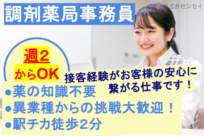 【仕事内容】 ◎週2からOK ◎未経験OK ◎駅近徒歩2分 ◎ブランクOK ◎無資格OK ◎社内割引あり ◎20代~40代活躍中 ◎長期休みOK(1週間休暇も取れます) ■調剤薬局の事務スタッフを募集します。 =========================== ママさん多数在籍!家庭と仕事を両立できる職場 =========================== 薬局で働く約7割の女性がママさんスタッフです。 育児をしながら働く方への理解もあるので、お子さまの行事や急な体調不良にも対応可能なシフト体制です。 “お互いさま”の雰囲気があり、サポート体制も充実した職場です。 ■具体的な仕事内容 ・薬の検品、検品薬の片づけ ・薬のピッキング 、分包機の操作 ・レセプト業務 ・在宅医療患者さんのお薬の準備・薬の配達(社用車有り) ・受付(患者情報などの簡単なデータ入力、電話・FAX 対応) 薬局勤務が初めてという方でも、データ入力からお教えするのでご安心! ※薬剤師も事務員も明るく笑顔いっぱいの雰囲気で楽しく働けます! ※薬についての説明は薬剤師が行うので、特別な知識はなくても大丈夫です! ■チャレンジのできる職場です ゆくゆくは正社員として働きたいという方も パートから正社員にキャリアアップする事が可能です! いきなりのご応募は不安という方も是非見学だけでも歓迎です。 ご質問などもお気軽にお問い合わせください。 ご連絡・ご応募お待ちしております。 詳しく知りたい方は、「 株式会社シセイ 」で検索してみてください! 【求人ID-DI01】