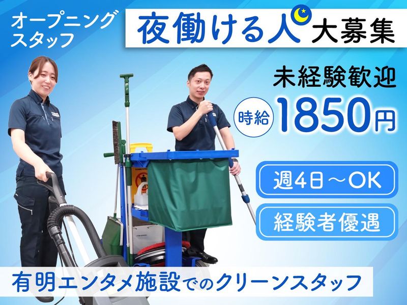 仕事内容 来春、有明にオープンする 複合型エンターテインメント施設の クリーンスタッフ。 2026年3月に開業する 複合型エンターテインメント施設の 【夜勤】オープニングスタッフを 20名大量募集いたします。 《主な業務》 ■共用部やシアター内の一般清掃 ■巡回清掃 ■トイレ巡回清掃 ■水回り清掃 すぐに覚えられる簡単作業! オープン前には研修を行い、 未経験の方にも丁寧に指導します◎ 週4日からOK!Wワークも可。 ※勤務開始は研修を含め2026年2月からになります。