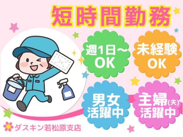 仕事内容 【扶養内勤務も可能です】 週1日からOK! 清掃スタッフ募集! (パート・アルバイト) 午前中だけの短時間勤務! ・直行直帰 ・土日祝休み ・平日だけの週1日~OK ・勤務開始日の相談OK! ・男女ともに活躍中! 【短時間清掃スタッフのお仕事内容】 お客さま先のお掃除をお願いします! 事務所・工場の落ち葉やごみ拾い、 外周の簡易清掃です。 【勤務時間】 7:00〜11:00(月・水のみ) 【清掃未経験者もOK】 先輩社員が同行し丁寧に教えます! 未経験から始めた方も多数活躍中です! 【活躍中のスタッフ】 ・主婦(夫)の方 ・中高年、シニア世代 ・清掃未経験の方 ・お掃除スキルを活かしたい方 【こんな方におすすめ!】 ・お掃除が得意な方 ・清掃経験がある方 ・短時間で働きたい方 ・扶養内で働きたい方 【ダスキンについて】 コロナ禍によって衛生管理への 意識が大きく様変わりしました。 お掃除を通して、衛生的な環境を 維持するお仕事をしています。 【コロナ対策】 ・出社時検温、うがい、手指消毒の徹底 ・常時オフィス内の空間除菌 ダスキンで働きながら ご家庭でも活かせる お掃除の技術を磨きませんか? 清掃のお仕事に興味のある方は、 経験・未経験問いませんので お気軽にお問合せください。
