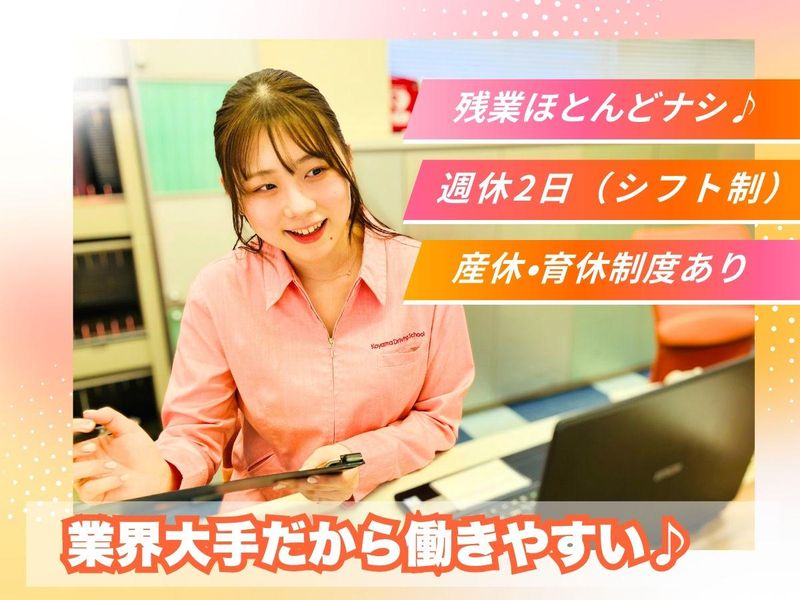 仕事内容 ⭐20代~30代が活躍中! ⭐月3日の希望日のお休みが可能 ⭐産休育休の取得実績あり♪ ━━━━━━━━━━━━━━━━━ ✨ 人気の自動車教習所で受付デビュー ✨ 接客×事務のいいとこ取り♪ ━━━━━━━━━━━━━━━━━ <人気の自動車教習所にて 受付(接客・事務)募集!!> 業界大手のリーディングカンパニー ”コヤマドライビングスクール” で【受付フロント】のお仕事♬ あなたにお願したいことは、 ✨ 教習生が「通いやすい!」と感じられるように やさしく・丁寧にサポートすること ♩ 「人と接する仕事がしたい」 「事務にもチャレンジしてみたい」 そんな方にピッタリのお仕事です。 ━━━━━━━━━━━━━━━ \ 未経験でも安心!その理由は? / ━━━━━━━━━━━━━━━ ✅ 入社後は【15日間の研修】あり ✅ 先輩がマンツーマンで丁寧にサポート ✅ まずはカンタンな受付業務からスタート あなたのペースに合わせて、 少しずつできることを 増やしていける環境なので 未経験スタートの方も安心です♪ ━━━━━━━━━━━━━━━ ❇ お任せするお仕事 ❇ ━━━━━━━━━━━━━━━ 【受付・接客業務】 ・入校手続きのご案内 ・スケジュール調整 ・電話対応 など 【事務業務】 ・データ入力 ・書類整理 ・備品管理 など ※売上ノルマや営業要素は一切ありません ━━━━━━━━━━━━━━━ ⌚ 1日の流れ(例) ⌚ ━━━━━━━━━━━━━━━ 09:00 出社 09:20 受講受付 10:30 パンフレット・教科書の在庫管理 11:00 入校手続き 12:00 お昼休憩 13:30 データ入力 14:20 受講受付 15:30 入校手続き 16:20 受講受付 17:30 教習生からの問い合わせ対応 18:20 受講受付 18:30 翌日の教習指導員の予定表出し 19:00 退社 ※校舎毎に勤務時間が異なります ━━━━━━━━━━━━━━━ ❣ この仕事の魅力 ❣ ━━━━━━━━━━━━━━━ ✨ 教習生から「ありがとう」と 言われるやりがい ✨ 接客と事務、両方のスキルが身につく ✨ 未経験スタートの先輩が多数活躍中 ✨ 落ち着いた環境で長く働ける