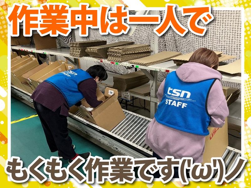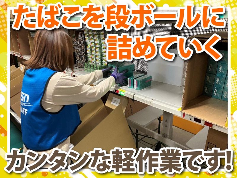 仕事内容 ✅冷暖房設備の大きくて綺麗な倉庫! ✅昼から勤務で朝はゆっくりできる♪ ✅プチボーナスや有給など福利厚生◎ ✅車・バイクOKで通勤らくらく♪ <具体的には> タバコ(カートン単位)のピッキングをお任せ。 出荷する店舗ごとに発注数量を揃える流れ作業です♪ 段ボール作成や箱出し、ラベルシールの貼付、 検品、テープ封印などの軽作業もございます◎ ※1カートン=タバコ10個です 基本的にはひとりでモクモク作業! スタッフ同士一列に並んで作業を進めます。 慣れれば簡単な作業♪ 作業スペースが決まっており、 その中で流れてくる段ボールに タバコを梱包していくイメージ。 シンプルな作業なので、 誰でも安心して始められますよ! 力仕事というよりは、 決められた作業をコツコツとこなすお仕事◎ 機械が表示する手順通りに作業を進めるので タバコの品名などの知識がなくてもOK! どのタバコを取るのか ライトが点滅するため一目で分かるので、 ゲームのように楽しく作業できます♪ <TSネットワーク株式会社について> 国内のたばこ流通シェアは99%以上!! 全国の店舗にたばこをお届けするために 必要不可欠なお仕事です◎ 大手JTグループという基盤があるため 安定した環境で長く働けますよ♪ ▼ホームページ https://www.tsnk.co.jp/