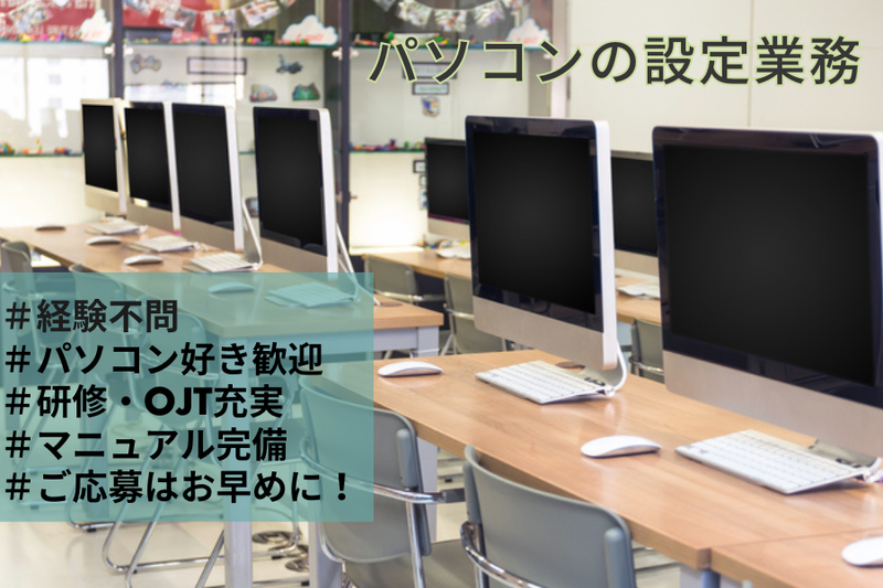 ■仕事内容 即日スタートのお仕事です!即日など開始時期を調整できます。ご相談ください。 鹿児島県鹿児島市与次郎の大手企業にてパソコンにシステムをダウンロードし、動作確認を行う業務をお任せします。 ITに関する専門知識は不要です! ※残業少な目、平日のみ、土日祝日お休み 【アピールポイント】 ・高時給1,400円!月収21万円以上も可能! ・未経験OK!マニュアル完備で安心スタート ・平日のみ・土日祝休み ・基本残業少なめ 【具体的な業務内容】 鹿児島県鹿児島市与次郎の大手グループ企業に出社し、ノートPCにシステムのインストールを行い、 パソコンを新たに使える状態にするお仕事となります。多少Excelの入力作業もあります。 全ての作業にマニュアルを完備しており、マニュアルに書かれている手順に沿って設定をおこないます。 【業務の流れ】 ・ノートパソコンが段ボールに入った状態で届くので、まず段ボールの開梱 ・手順書、マニュアルに沿ってシステムをインストールし、変な挙動がないか動作確認 ・ラベル分けや使用者を判別するためのバーコード類のシール貼り付け ・シールを貼り付けたパソコンを再度段ボールに梱包 ・運送業者に引き渡し、またはクライアント先に訪問し設置をします。 手順書通りに業務をおこなえば、どなたでも簡単にできるお仕事です! 重いものを運ぶことも少なく、手軽に始めることができます。 未経験でも応募可能です。希望があれば腰を据えてじっくりとエンジニアを一緒に目指せる環境です。 もちろんIT知識のある方(独学OK)、少しでもIT系の実務経験がある方は大歓迎! OJTもしっかりしていて経験を積むことができます。 基本的な知識・スキルは入社後の研修で身に付きます 。 年間休日120日以上!土日祝休みです。 しっかりとOJTをしますので、ゼロから経験を積むことができます。 【応募資格】 ・学歴不問、経験不問、資格不問 ・運転免許証 尚良し:エンジニアに興味がある方 【オススメポイント】 常駐先企業では分からないことがあればどんなことも質問できる環境です。 未経験からキャリアを始めた方ばかりですので、気軽に相談ができます。 将来的に派遣先の直接雇用になれる可能性もございます。 ITインフラに興味があればぜひご応募ください。 【勤務開始時期】 即日、調整可能です。 【こんな方は歓迎】 ・未経験歓迎、初心者OK ・パソコン操作や、組立など、PC関連に興味をお持ちの方 ・ブランクがある方も大歓迎 ・駅近くでお仕事をお探しの方 ・家庭と両立して働きたい主婦(主夫)さん ・フルタイム希望のフリーターさん 【こんな方が活躍中】 ・20代、30代、40代の男女スタッフ活躍中! ・ミドル世代の方も活躍できる環境です! ・ハローワークでお仕事をお探しの方もOK! ・ITサポート、社内SE、キッティング、パソコンセットアップ、エンジニア、一般事務、庶務、総務、営業アシスタント、オフィスワーク、事務補助、データ入力、などの求人をお探しの方にもおすすめ! ■仕事の特徴 駅チカ・駅ナカ フルタイム歓迎 フリーター歓迎 学歴不問 未経験・初心者OK 資格不問