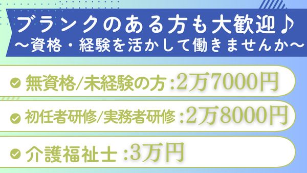 無資格・未経験の方:2万7000円~/初任者研修・実務者研修:2万8000円~ 経験・資格を活かして、より良い環境・待遇でもう一度度働きませんか?