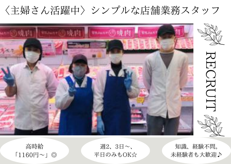 仕事内容 *…*…* アピールポイント *…*…* ✅未経験OK! ✅週に1~3時間OK ✅お仕事終わりにお買い物もできる! ✅扶養内勤務可 ✅主婦、学生、フリーター活躍中 ✅シフトは柔軟に対応〉 ※勤務時間、出勤日数も融通バッチリ♪ 家事、育児、私生活と両立可能です◎ ✅「ルミエール福津」店内でのお仕事なので お仕事終わりにお買い物もできちゃいます。 ──────────────────── ⭐お仕事内容⭐ ____________________ 地域に根ざした精肉、お惣菜のお店♪ 簡単な調理、店内作業のお仕事です◎ 〈具体的には…〉 ✅お肉のカット ✅お惣菜の調理 ✅商品包装、陳列 ✅店内の清掃業務 等の難しくない業務内容です。 ※業務内容は「シンプル」かつ「簡単」。 普段の家庭での調理経験も活かせます☆ ✨抜群のフォロー体制  ̄ ̄ ̄ ̄ ̄ ̄ ̄ ̄ ̄ ̄ ̄ 最初は先輩スタッフが丁寧に教えます。 全くの未経験の方もご安心くださいね◎ ※高齢の方、主婦等のご家族の方をメインとして、 お惣菜やお肉が「丁度良い量が買える!」ことが 人気の秘訣♪