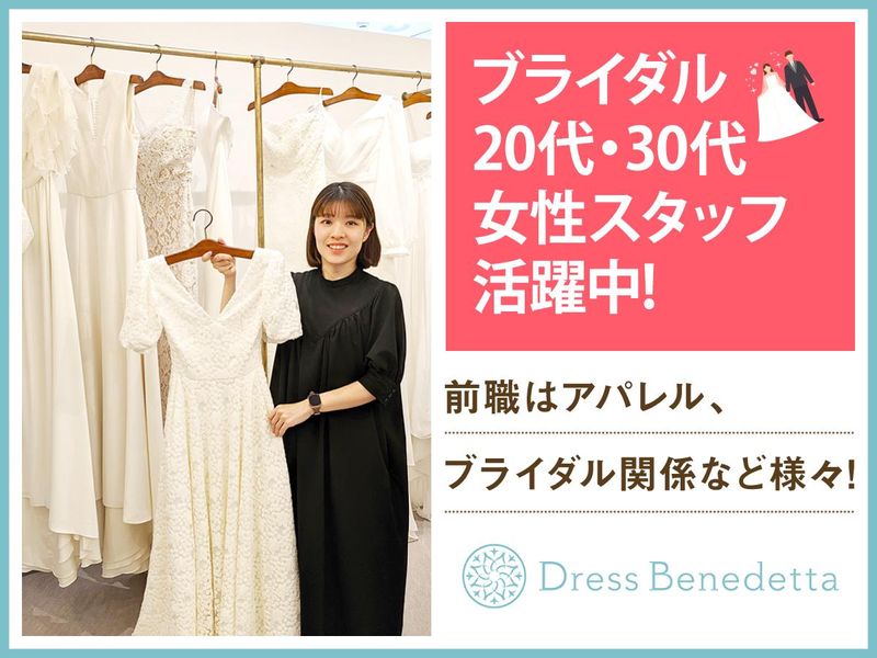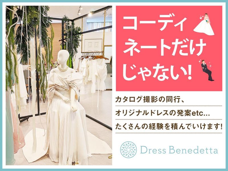 仕事内容 「私らしさ」を叶える、特別な一着を。―― “ただ綺麗なだけじゃない、 自分らしいドレスが着たい” そんな花嫁の想いに寄り添うのが、ドレスベネデッタです。 コンセプトは 【 なりたい花嫁になれる 】。 まるで洋服のように自由に、 リアルクローズを意識した最旬トレンドのドレスをご提案しています。 例えば… ▫パンツスタイルやセパレートドレスなど、個性を表現できるデザイン ▫レースやチュール、サテンなど素材感にもこだわったラインナップ ▫トップスとスカートを自由に組み合わせて“私だけ”のスタイルに ―――――――――――――――――――― ○● お仕事内容詳細 ●○ 結婚式・披露宴・1.5次会・2次会に向けて、 新郎新婦さまの衣装コーディネートをお任せします! ▼具体的には… ・ご希望をじっくりヒアリング(1組3時間の接客) ・お二人の想いに合った衣装をご提案 ・フィッティングのサポート ・アクセサリーやヘッドドレスなど小物のご提案 ・店内ディスプレイやドレスのメンテナンスも 『 「衣装選びが一番楽しかった!」 そう言っていただけるような、 心に残るご案内を一緒に目指しませんか? 』 - ○● ドレスベネデッタで働く魅力 ●○ ▫『1組3時間の完全予約制接客』▫ → 流れ作業じゃない、心からのご提案ができる! ▫『ドレスの企画やカタログ撮影にも参加OK』▫ → あなたの発想が、新しいドレスになるかも♪ ▫『研修&サポート体制も安心』▫ → 経験が浅くても大丈夫。周りがしっかり支えてくれます◎ ※ブライダル業界の勤務経験は必須(年数不問) ○○○●● 「ドレスにもっと自由を。」 「誰かの“特別な1日”を、私らしく支えたい。」 そんな気持ちを大切に、 ドレスベネデッタで“私の経験”をもっと輝かせてみませんか? ●●●○○