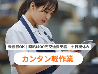 仕事内容 【短期OK(9月末まで)】 *時給1400円*未経験OK/軽作業 \コツコツ作業が好きな方におすすめ/ かんたんピッキングスタッフ募集! ・重たい物なし ・空調完備で快適 ・すぐ覚えられるシンプル作業 ⸻⸻⸻⸻ ■未経験OK ■土日祝休み ■服装・髪色自由 ■研修あり ⸻⸻⸻⸻ 【仕事内容】 ・検品、梱包作業 ・ピッキング シンプルなコツコツ作業が中心で 未経験の方でもすぐに慣れていただけます! 期間限定勤務で、 転職活動の合間にもおすすめ♪ ▪️誰でもできるカンタンな作業なので 未経験の方でも安心です◎
