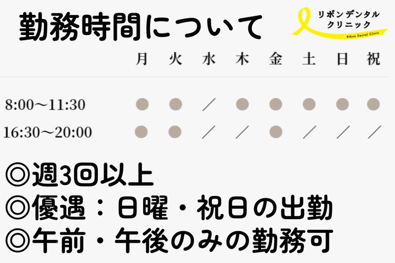 シフト制 【勤務時間】 ■午前診療日(土・日・祝) 8:00-12:00 ■午後診察日(月・火・金のみ) 13:00-17:00 ■水曜、木曜休診 ■月、火、金の午後勤務や土日祝の午前勤務が可能な方 ■週3回からOK ■残業について 働くスタッフのワーク・ライフ・バランスを重視しているので、残業はほとんどありません。 ✅詳しくは写真2枚目をご覧ください