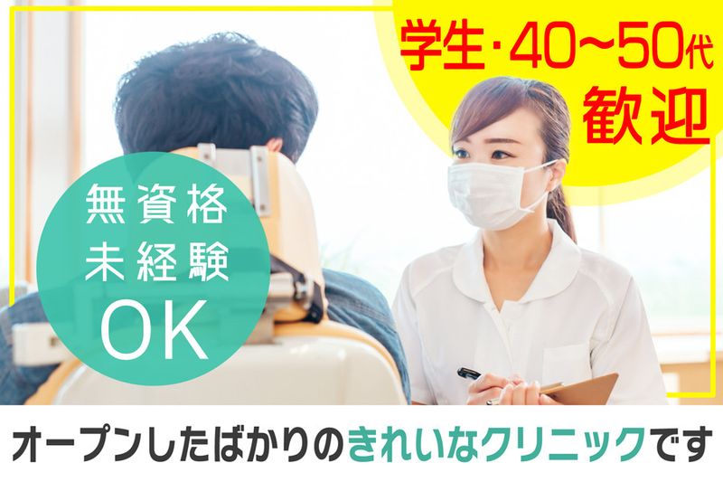 【アピールポイント】 ⭐40代50代の主婦(主夫)さん・学生さん活躍中⭐ 新しくキレイなデンタルクリニックにて歯科助手募集 ■無資格・未経験の方も活躍中 ■時給1,300円・昇給あり ■月、火、金の午後勤務や土日祝の午前勤務が可能な方