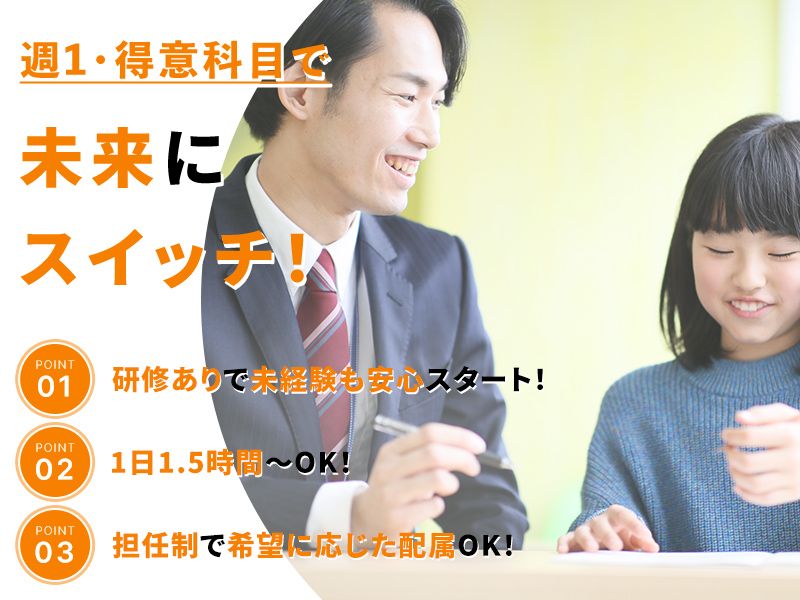 仕事内容 \実務未経験OK!教育体制充実で安心/ ✅週1日・1日1.5時間〜自由に働ける ✅保護者対応なし!授業に専念できる ✅持ち帰り仕事&授業前の事前準備なし ✅デビュー後も質問しやすいフォロー体制 ✅固定制で自分の得意分野を活かせる ー 【仕事内容】 個別専門塾にて授業をお任せします。 講師1人に対して、 生徒1~2人を担当していきます。 〇具体的には… 指導対象は小学生~高校生まで幅広く、 科目や学年はご希望を考慮します! 少人数制の授業のため、 生徒一人ひとりと向き合って じっくりと指導することができますよ。 *小学生2割、中学生5割、高校生3割です! 〇「得意」を活かせる! 得意な英語だけ…というのもOK! まずはできることから始めましょう!