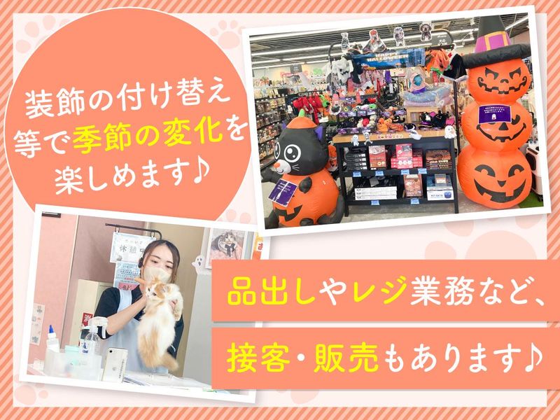 仕事内容 ペットショップ業務全般をお願いします! <具体的には・・・> ◆わんちゃん・ねこちゃんのお世話 ◆ご飯作り ◆お部屋のお掃除 ◆体調管理 ◆レジ ◆品出し ◆接客・販売 ◆新しいご家族を見つける(接客) ~☆~☆~☆~☆~☆~☆~☆~☆~☆~ 「動物が好き」「お世話をするのが好き」 そんな気持ちがあれば、 知識も経験も要りません! 頼れる先輩がしっかりフォローしますし、 必要な知識はお仕事を 通じて自然に身に付きます。 安心して飛び込んできて下さいね!! 女性スタッフ活躍中です♪ 自分の家族のように 愛情をもって接することの 出来る方を求めています! 新しいご家族(飼い主さん)に 出会うまでは、体調管理など とっても重要なお仕事! 愛情を注ぐ分、 新しいご家族のところへいくと 寂しい気持ちもありますが、、、 わんちゃん・ねこちゃんなどが 元気で楽しく過ごせることが大切なので、 それまでの期間をしっかり お世話してあげましょう! 季節ごとの商品に合わせて 店内ディスプレイも変更するので どうやったら見やすいか? 手に取ってもらいやすいか? などを考えながら作業するのも とっても楽しいお仕事のひとつです♪ ~☆~☆~☆~☆~☆~☆~☆~☆~☆~
