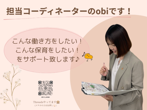 保育士/保育補助/小規模企業内保育園/土日祝完全休み/茨城県つくば市/車通勤可/@有資格/EOH1119 保育士/保育補助/小規模企業内保育園/ 茨城県つくば市 派遣社員 求人の特徴 4 週 10 休 オンコールなし 原則定時退社 固定シフト制 土日祝休み 夜勤なし 完全週休二日制 実働 7.5 時間 平日のみ OK 年間休日 120 日以上 残業なし 残業ほぼなし 深夜勤務なし 週 4 日以上 OK 大卒 専門卒 短大卒 高卒・高認合格 高専卒 保育園 小規模保育園 認可保育園 認定保育園 インフルエンザ予防接種補助あり 交通費全額支給 交通費支給 年末年始休暇あり 有給休暇あり 40 代も応募可 50 代も応募可 60 代も応募可 ブランク OK 主婦・主夫歓迎 子育て世代歓迎 学歴不問 新卒歓迎 未経験者歓迎 業界未経験者歓迎 第二新卒歓迎 経験浅め歓迎 リモート面接 OK 勤務開始時期調整 友達と応募 OK 急募 電話で応募・問い合わせ 面接 1 回 転職回数不問 オフィスカジュアル OK カジュアル OK クールビズ OK スニーカー OK 制服あり 服装自由 車通勤 OK 業務内容 ●茨城県つくば市にある小規模企業内保育園にて保育補助のお仕事です。 ●定員は30名ですが、現時点で利用されているお子さんは10名弱です。 ●10名弱のお子さんの保育なので、一人一人をゆっくり関わることが出来ます。 ●基本的にはお子さんのサポート、準備、片付け、掃除などになります。 ●立案などの書類やリーダー業務などはありません。 ー 毎日働く職場…事前に知っておきたいことがたくさんありますよね! 業務内容やお給料のこと…ご自身では保育園に対して直接聞きづらいことも担当コーディネーターが変わりにお話を伺います! 気になることやご不安なことがございましたらお気軽にお問合せ下さいませ。 ・・・・・・・・・・・・・・・・・・・・・・・ あんだんてでは求職者一人ひとりの状況を詳しく聴かせてもらい、そしてあんだんてという会社・担当コーディネータのことを知ってもらうことも大事にしています。 その結果、条件面だけでなく園の方針やカリキュラム、連絡帳の有無(形式)など細かなことまで、一人ひとりの希望にあった園がご紹介できると考えています! 就業後も希望者には月1回の訪問や三者面談などを実施。仕事の悩みやご不満だけでなくプライベートの悩みも相談に乗りますよ! ※もし担当コーディネータと相性があわない場合は気軽にお知らせください!別の担当を紹介します! ・・・・・・・・・・・・・・・・・・・・・・・ ★この募集求人を担当するコーディネータを紹介★ 担当のobiです! お仕事探しで気になる点や、確認をしづらい、自分では聞きづらい…ということなど、代わりに確認致します! 面接・就労前にスッキリしてから勤務出来るようサポートいたします♪ 気になることは遠慮なくお問い合わせください^^ <プロフィール> ・保育士歴10年(認可園2園にて勤務をしていました) ・幼児教室講師歴3年4カ月 ・2児兄弟を育てるワーママです 直接お目にかかれる機会を楽しみにしています!! ※当社が雇用する派遣スタッフとして派遣先で勤務いただきます 職種 保育士/保育補助/小規模企業内保育園/ 雇用形態 派遣社員 勤務体系 固定時間制 リモートワーク制度 リモートワークなし 勤務先事業内容 保育士、幼稚園教諭、栄養士・調理師、保育園・幼稚園事務の派遣と紹介、及び人材コーディネート 研修プログラム作成 ペーパー保育士研修他派遣