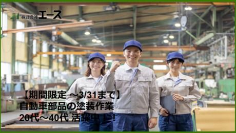 仕事内容 仕事内容 トラックバス・乗用車・フォークリフトなどに使用される部品の塗装作業になります。 ・塗装ラインでの塗装吹付・箱詰め ⇒専用のハンガーへ部品を引っ掛ける⇒ボタンを押して吹き付け塗装⇒部品を取り外す⇒完成品の箱詰め 業界問わず塗装業務の経験のある方は経験を活かせます!! 入社時に新人研修もしっかり行いますので業界未経験の方も安心!! 求人のポイント ・来年3/31までの期間限定の高時給のお仕事です。 また期間限定での応募だったが、このまま継続して同じ業務を続けることも可能ですので、ご相談ください。※就業条件変更あり。 ・土日祝休みの週休二日、GW、夏季休暇、年末年始など長期休暇あり(年間休日112日) ・事前に職場の見学が可能なのでしっかり仕事内容を見てからスタートできます。 ・頑張り次第で派遣先企業での直接雇用(正社員登用 過去の実績あり)の可能性あり。 【株式会社エースの特徴】 株式会社エースでは、事務職や物流関連、工場勤務や製造業の経験がない方やベテランスタッフもそれぞれの環境に沿ったお仕事をご紹介いたします。 現在、お仕事をしていただいてるスタッフさんは 年齢幅も20代、30代、40代、50代の方など幅広い年代のスタッフさんが活躍しています! また勤務スタイルも、あなたに最適な働き方をご提案をさせていただきますのでご安心ください! 例えば土日祝休みが希望、 ゴールデンウィーク、夏季休暇、年末年始などの長期休暇が有る職場が希望、 長期間働ける職場が希望! 短期間働いて自分の趣味との両立をしたい、登録だけしておきたい、などなど・・・ ご自身の希望する働き方をお気軽に相談してください! 転職希望の方や、正社員で働くためにスキル UPをしたい方もぜひご相談を !
