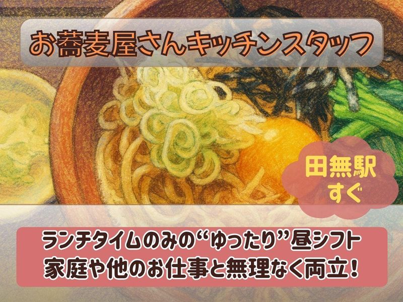 仕事内容 私たちのお店は、昭和の懐かしさを感じる和風の店内で、手打ちそばを提供しています。 そばレストランとして、女性のお客様にも多く親しまれており、落ち着いた雰囲気とおもてなしの心で、多くの方々に愛され続けています。 地元のサラリーマンや家族連れ、特に女性客にも人気のある温かい雰囲気のお店です。 ★ 未経験OK!家庭と両立しながら働ける! ★ 主婦(夫)歓迎!シフトは柔軟に対応◎ ★ 平日のみの勤務も可能♪ 仕事内容 キッチンスタッフとして、調理業務を中心にお任せします。 ~具体的には~ 手打ちそばの準備 料理の盛り付け 食材の仕込み キッチンの片付け など *まずは簡単な業務からスタート! 未経験の方でも安心して始められます。 家庭との両立がしやすい柔軟なシフトも魅力です。 <<希望する方には、そばの実を石臼で自家製粉した蕎麦粉を使用したそば打ちを覚える事も可能です>>
