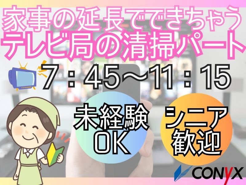 【仕事内容】 ⭕扶養内OK ⭕基本1人作業でマイペースOK ⭕午前勤務だから午後はプライベートの時間に♪ 栄にあるテレビ放送局のオフィスビルの清掃スタッフを募集中! 【主なお仕事内容】 ✅通路 ✅階段 ✅トイレ ✅会議室 テレビ局内の掃き掃除やモップ掛けなど、 家事の延長でできるモクモク作業です。 難しい作業、機械の操作はありません! 未経験の方も始めやすいお仕事です。 平日は6名程度、土日は2~3名程度で作業しています。 担当場所が決まっているので、ひとりでモクモクと勤務できますよ。 困った事があっても、周りのスタッフにすぐに相談できる、安心の環境です! 20代~60代まで、幅広い年代のスタッフが活躍中の、 落ち着いた雰囲気の職場です♪ ===================== 充実したサポートが自慢です ===================== 創業70年以上のコニックスだからこそ、 働くスタッフへのフォロー体制は抜群です! ⭐覚えられるまで丁寧にしっかりとサポート! ⭐必要時には担当スタッフがすぐにフォロー! ⭐お休みも取りやすい環境です! まずはご相談からでも、お気軽にご応募ください! 【求人ID-CRN10A】