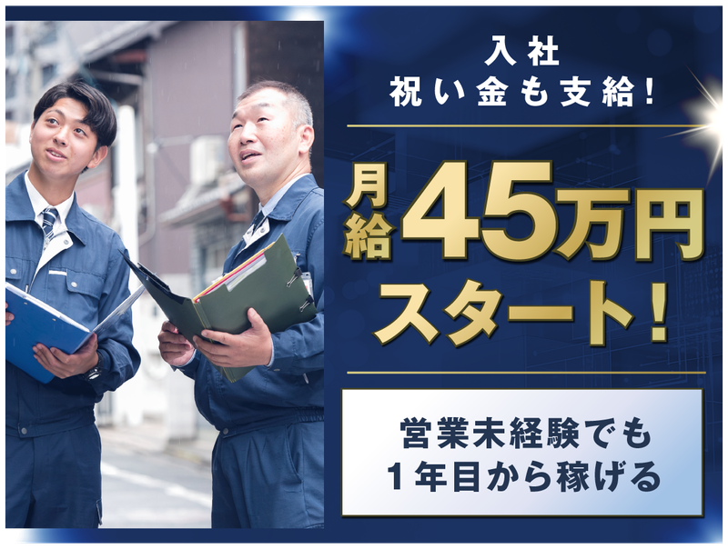 月給450,000円~1,000,000円 給与詳細 ※基本給・固定残業代・一律手当の総額 基本給:月給 25万5000円 〜 80万5000円 固定残業代:あり 1ヶ月あたり5万円(固定残業時間:1ヶ月あたり20時間) 固定残業時間を超えた勤務時間については別途残業代を支給する 【一律手当】 全員に一律で支払われる通勤・皆勤・家族手当金額:なし 全員に一律で支払われるその他手当金額:あり 1ヶ月あたり14万5000円 ※精勤手当14万5000円は1ヶ月目のみ ~給与詳細~ *入社1カ月目 └月収45万円(月給30万5000円+精勤手当14万5000円)+オーダー賞(成約1件につき5000円) *入社2カ月目 └月収30万5000円+高額歩合給+オーダー賞 *3ヶ月目 └月収48万5000円(月給30万5000円+入社祝い金18万円)+高額歩合給+オーダー賞 *4ヶ月目以降 └月給30万5000円+高額歩合給+オーダー賞 入社2カ月目から歩合の還元率がアップ! 早い段階から成果に応じてしっかり稼げます! 【給与例】 給与例 【年収例】 1100万円/入社4年(月給36万円+報奨金) 720万円/入社3年(月給34万円+報奨金) 650万円/入社1年(月給30万5000円+報奨金←未経験入社初年度例) 経験や年齢関係なく、成果を平等に還元する風土です! 【その他】 <本数達成賞(歩合給)あり> 1件受注するごとに支給 ※業績により報酬はさらに高額になります ※2ヶ月目以降は本数達成賞が2倍! <入社祝い金最大138万円支給> 入社3ヶ月目に入社祝金18万円を支給。後に 6ヶ月間の業績に応じ、最大120万円の祝金を支給。 ※初年度の年収例に入社祝金は含まれていません。 <高収入・高額ワーク> 歩合給あり+インセンティブあり!
