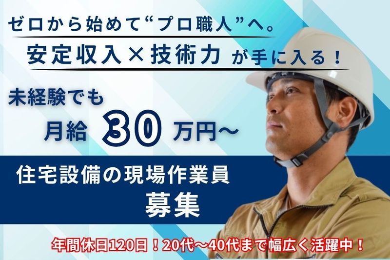 【仕事内容】 ⏰未経験OK!現場作業スタッフ募集! 業務拡大につき、施工メンバーを増員します! 当社は住宅設備のメンテナンスからリフォーム・改修まで幅広く対応する地域密着型の企業です。 お客様の「快適な暮らし」を支える存在として、今後さらなる成長が期待される中、新たな仲間を迎え入れ体制を強化していきます。 【ココで働くおすすめポイント】 ⭕️月給30万円~で稼げる ⭕️年間休日120日以上でプライベートも充実 ⭕️未経験安心!作業は2人1組 ⏩️仕事内容 瓦の補強や塗装など、住宅の外回りの補強作業を担当いただきます(戸建て住宅が中心)。 エコキュートやソーラー、屋根リフォームなど住宅設備の設置作業もあり。 ※現場は春日井市の事務所に集合後、社用車で向かいます。 ============== ✅月給30~60万円で稼げる! ============== 未経験でも月給30万円でガッツリ稼げる! 手に職がつく×安定収入が叶います✨ 年間休日120日以上で仕事とプライベートの両立も可能で、無理なく長く続けられる環境です。 ======= ✅未経験OK! ======= 作業は2人1組で行うため、未経験でも安心! 半年後には作業の流れがつかめるようになります。 ========= ✅入社3年でプロに ========= 入社3年後には、“プロの施工職人”として独り立ちも可能! 手に職がつけられる環境です。 【求人ID-GNB】