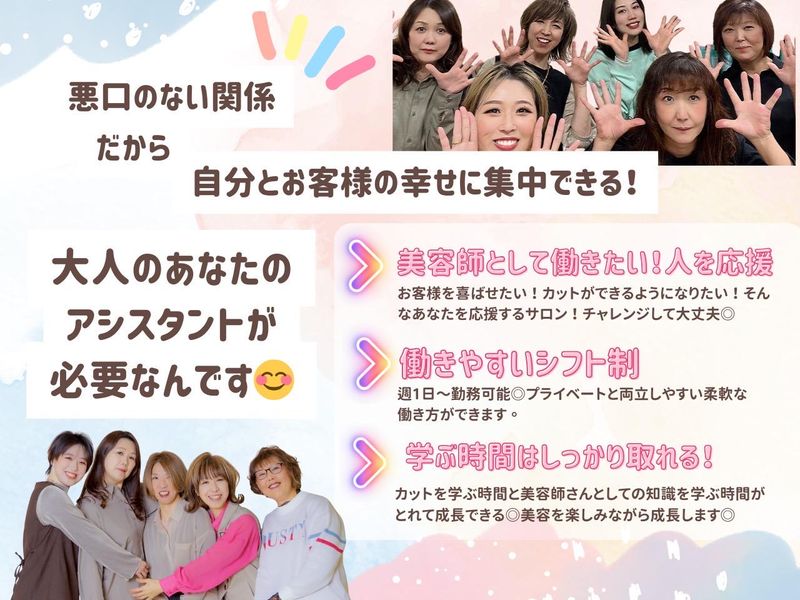 仕事内容 MEGAドンキホーテ蓮田店内の 美容室でのサロンワークです★ 「美容師もう一度やってみたいけど、 ブランクが長くて…」 「子供の急な熱。迷惑かけちゃうかな…」 そんな方も安心してください! ◇◆この求人のおすすめPoint♪◆◇ ・勤務は週1日~OK! ・丁寧なサポート体制☆ ・難しい技術は要りません! 【業務内容】 カラー塗布、シャンプなど スタイリストをサポートする アシスタント業務をお願いします! 【AXE-LEVEが「働きやすい」3つの理由】 ☆理由1:シフトの融通、利かせます☆ 週1日、1日3時間から勤務OK。 午前だけ、夕方まで、夕方だけなどご相談ください お子様の学校行事や急な体調不良など、 家庭都合のお休みも全員でカバー! 土日休みも可能なので、 週末は家族との時間にしっかり使えます。 ☆理由2:難しい技術は、いりません☆ 流行りのスタイルや 特殊パーマはありません。 ブランクがあっても安心です。 お客様は50代以上が半数を占める、 地元の方が中心です。 ☆理由3:頼れる仲間がいます☆ スタッフは30代〜50代の女性6名 。 同じように子育てと両立してきた先輩ばかりです。 困った時は「お互い様」の気持ちで助け合う、あたたかい雰囲気の少人数サロンです。 ブランクがあっても、 安心・納得できるまで丁寧に教えます◎ ~~AXE-LEVEについて~~ MEGAドンキホーテ蓮田店内に 店を構える当社は創業26年。 10代〜90代まで幅広いお客様に ご来店頂いており、 そのうち50代~のお客様が 占める割合が50%以上。 客単価は7000円程度で、 白髪染めや髪のメンテナンスなどを目的に お気軽にお立ちより頂けるサロンとして、 地元の皆様にご来店いただいております。 「ここのサロンに来ると、なんか元気になる」 そんなお声が本当にある当サロン。 それは、スタッフ同士もお互いを尊重し合い、 「助けて」の声を上げられる、 「オッケー!助けるよ!なんでも言ってね」 という反応がある。 そんな風土がお客様にも伝わっているから。 無理しない。もう辞めなくていい。 長く続けられるサロン。 もしも人間関係で悩んでいる人がいるなら… AXE-LEVEで美容師やり直しませんか? ((詳細データ)) 常連様の平均再来率96.6% セット面7席/サイドシャンプー台3台 ~~~~~~~~~~~~~~~~~~ / 少しでも興味の湧いた方、 是非、ご応募お待ちしております! まずはお気軽にサロン見学!(´-`*) \