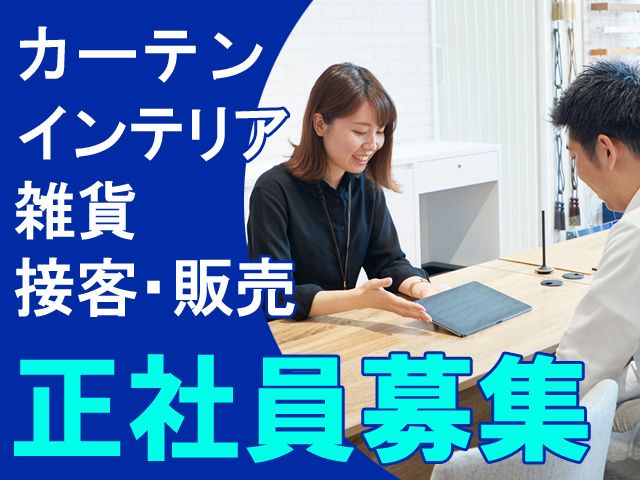 仕事内容 カーテンやじゅうたんの専門店にて 接客販売スタッフを正社員で募集をしております。 【仕事内容】 インテリア関連商品(カーテン、カーペット、雑貨商品等)の接客・販売業務 ・商品の提案、販売 ・オーダーメイドのカーテンやカーペットの商談 ・在庫管理 ・売り場作り ・スタッフの育成 ・店舗マネジメント ・お客様のお家へ訪問(提案や採寸等) 新築や掛替でご来店いただくお客様に、オーダーカーテン等の提案・販売業務をお願いします。 間取りや窓サイズをお聞きし、お客様の好みに合わせ色味や生地のご提案をします。 基本から丁寧に指導いたしますのでお仕事をしながらオーダーカーテンやカーペットに詳しくなれます。 また、販売だけでなく、スタッフの育成、在庫管理、売場作り等、店舗マネジメント業務全般もお願いします。 ◆未経験大歓迎! 「インテリアが好き、興味がある」まずはそれだけでOKです! ほとんどの方が未経験からのスタートです カーテンとじゅうたんの専門店として、イチから商品知識をお伝えします◎ もちろん経験者も大歓迎! 飲食店やサービス業でのパート・アルバイト経験なども活かせますよ 接客マニュアルはありますが、「自分らしい接客」ができる職場です! ◆充実した研修制度有! 商品研修、店舗研修、他、必要に合わせて実施致します ◆U・Iターン歓迎 希望を配慮し、下記いずれかの店舗に配属 (東大宮バイパス・川越・熊谷・東川口・春日部・せんげん台・戸田・朝霞・桶川・久喜・坂戸) ◆第2新卒歓迎 平均年齢30歳 毎年新卒採用も行っており、多くの人財を1から育ててきた実績があります 【販売スタッフのある1日のスケジュール】平日 10:00~ ・朝礼、ロープレ ・前日の引継確認 ・開店準備 10:30~ ・開店 ・接客及び、客注、メーカー 問合せの対応や入荷商品の検品 採寸の為の外出など ・店内整理など 12:00~14:00 ・交代でお昼休憩 18:00~ ・閉店準備 ・売り場整理 18:30 ・閉店 19:00 ・退社 WEB面接にも対応しているので、まずはお気軽にお問い合わせ下さい
