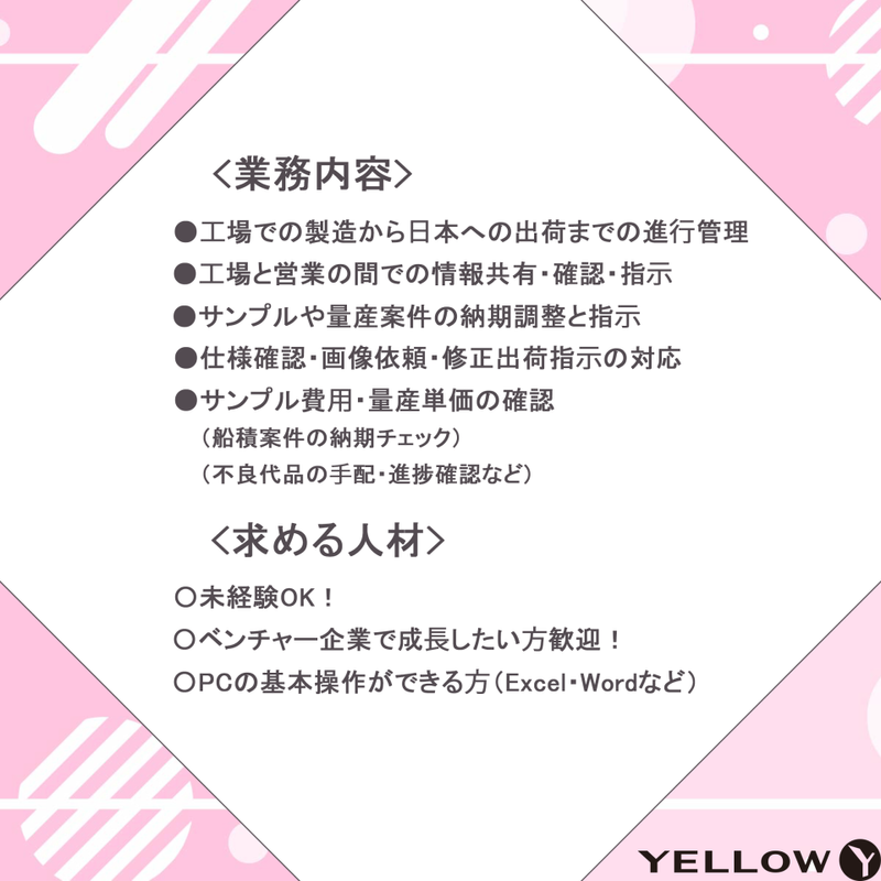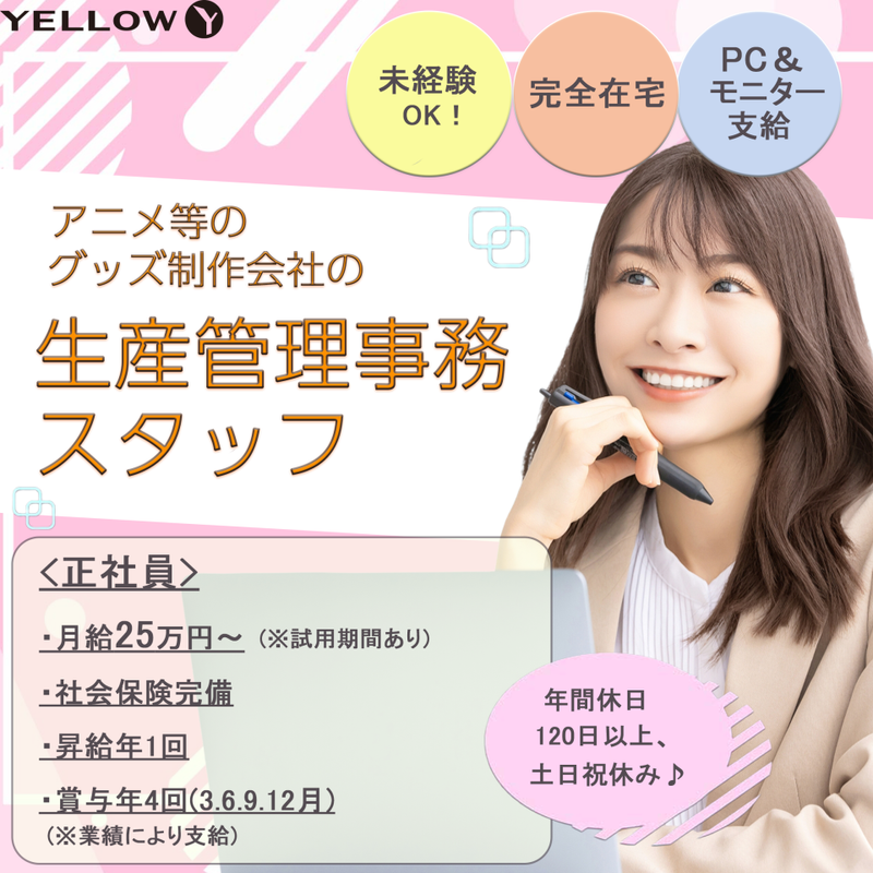 仕事内容 ✨年間休日120日以上、土日祝休み✨ ✨フルリモート勤務で働きやすい✨ ✨賞与年4回!残業が少ない♪✨ ✧₊――˚✧₊――˚✧₊――˚✧₊――✧₊――₊✧ \工場と営業の架け橋に✨/ 「営業さんを支える仕事がしたい!」 「在宅しながら働きたい!」 そんなあなたにピッタリのお仕事です。 イエロー株式会社 は、アパレル・スポーツ・ アニメ・ゲーム・アイドルなど、 幅広いジャンルのオリジナルグッズを 企画・製作する成長企業です。 そんな当社の”要”となる 工場の出荷管理や納期調整を 担っていただきます ✧₊――˚✧₊――˚✧₊――˚✧₊――✧₊――₊✧ ✅お任せしたいお仕事内容 ___________________ ◆工場での製造から 日本への出荷までの進行管理 ◆工場と営業の間での 情報共有・確認・指示 ◆サンプルや量産案件の 納期調整と指示 ◆仕様確認・画像依頼・修正 出荷指示の対応 ◆サンプル費用・量産単価の確認 (船積案件の納期チェック) (不良代品の手配・進捗確認) など… どれも在宅でできるお仕事です♪ ✅こんな方にピッタリ! ___________________ ▼1つでも当てはまったらぜひご応募を♪ ◇成長企業で働きながら、スキルアップしたい! ◇未経験から挑戦してみたい! ◇在宅しながら仕事がしたい! ◇PC操作が得意・経験がある! ◇ブランクがあるけど働いてみたい! ◇事務経験を活かしたい ◇管理が得意 など あなたのサポートが会社の成長につながります! ご応募、お待ちしています!
