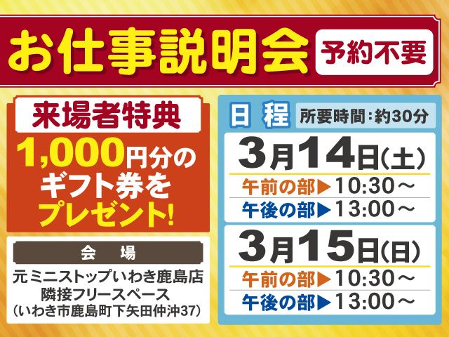 応募方法 お電話または応募フォームよりエントリーください。 応募フォームからなら、24時間応募受付可能です。 WEBエントリー頂いた方には、ご応募確認後に担当者よりご連絡いたします。 お電話にご都合のいい時間帯がございましたら、備考欄にご記入いただけますと幸いです。 <お仕事説明会も開催中> 予約不要でどなたでもご参加いただけます。 ご来場頂いた方全員に、1,000円分のギフト券をプレゼント! ドライバー経験の有無は問いませんので、お気軽にご参加ください。 【会場】 いわき市鹿島町下矢田仲沖37 (元ミニストップいわき鹿島店の隣接フリースペース) 【日程】※所要時間:約30分 3月14日(土) 10:30~/13:00~ 3月15日(日) 10:30~/13:00~ 【ご応募後について】 応募完了後、応募時に入力していただいたメールアドレス・電話番号(SMS)宛に、 応募企業とのメッセージのやり取りを開始するために通知をする可能性がございます。