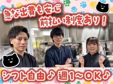 仕事内容 居酒屋のキッチンのお仕事をお任せします! 簡単な料理のお手伝いからスタートするため、 未経験さんも安心して始められますよ* 【具体的なお仕事は】 *先輩の調理業務のお手伝い *調理用具の洗浄 *食材の仕込み作業(食材の事前準備) *料理の盛り付け 上記のような簡単なお手伝いから 少しずつお任せしていきます! 最初は食材の保管場所の確認など 基本から丁寧にお教えしますので、 居酒屋&バイトデビューの方も安心* 少しずつ料理に挑戦することになっても、 先輩スタッフがサポートをしますので、 分からないことや困ったことがあれば、 いつでも気軽にご相談くださいね! 楽しく&安心して働けるよう、 しっかりとフォローします* <働きやすい!シフト自由!> お仕事は週1日~、1日3時間~OK! 学校やWワーク、家事との両立がしやすく、 学生さんやフリーターさん、主婦さんなど、 幅広い世代のスタッフさんが活躍中です! <急な出費も安心!> 基本的には毎月20日に給与をお支払いしますが、 前月の稼働分を月初にお支払いできる 「前払い制度」もご用意しています! 飲み会が立て続けで給料日まで間に合わない、、、 急に欲しい物ができてお金が必要になった。。。 などの緊急事態にも柔軟に対応できますよ!