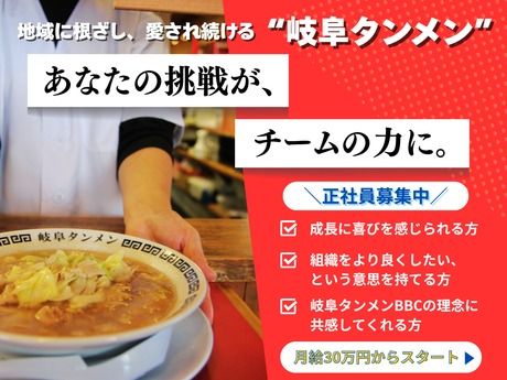 仕事内容 「今の場所じゃムリ」そんなアナタのためのお店 =================== ◆「上に行きたい」欲を全力サポート◆ 100店舗目指して、店舗数拡大中! 狙えるポストがどんどん生まれています。 入社から最短6ヶ月でマネジメント社員への昇進も可! ◆ワークライフバランス重視◆ 月8日休み×月平均残業2h以下! 入社1年で年収400万以上など収入面も充実。 ◆負担の少ない現場◆ 仕込み作業は機械化により包丁いらずに。 厨房は広くて、普段の仕事も快適! =================== 「仕事が大変すぎて、もうやっていけない」 「頑張ってるのに、昇進もなんにもない」 そんな悩める方にこそ、 この「岐阜タンメン」のお店に来てほしいと思っています。 企業理念の「人にやさしくあたたかく」は お客様だけでなく、働くスタッフにも向けられたもの。 ワークライフバランスを大切にした安心できる環境、 やりがいを持ち続けられるキャリアパス、 その他もろもろを用意して、 飲食の世界で頑張りたいあなたを応援します。 ◆仕事内容◆ まずは店舗スタッフとして、一般的なホール・キッチンの業務全般をお願いします。 ●カウンター・ボックス席ともに厨房から直接料理提供ができる位置。 小規模店舗で、店内をバタバタすることがありません。 ●厨房は広めにできており、動線も考えられた快適な配置になっています。 便利な機械を導入しているので、作業量もかなり少なくなりました! ●新入社員受け入れのためのトレーニングセンターも完備。 「そこまで経験に自信がない」という方でも安心してスタートできます。 ●慣れてきたら、食材の発注、アルバイト・パートスタッフの教育、面接など 運営面の仕事もお願いしていきます。 ●今回のポジションでは、東海または近隣エリアの店舗への転勤があります。 ※当社での「転勤」とは、家から35km圏内(または車で1時間以内)を越える店への異動を指します。 転勤時の家賃は会社負担(規定有)で、別途転勤手当(毎月4万円~7.5万円)も支給。 ◆あなたの「席」、用意できてます!◆ これまで、店長に色々な業務が集中しがちだった当社。 このままではよくない…ということで、 思い切って「店長」という役割をなくしました! これにより、現在の岐阜タンメンでは ・1店舗を管理する「マネジメント社員」 ・3店舗を管理する「統括マネージャー」 の2人がかりで管理を行っており、 業務を分担できるようになって、管理の負担がぐっと減りました。 「2032年までに100店舗」を目指し、店舗数を拡大中。 それに伴い、上記のマネジメント職のポストも次々生まれています! キャリアアップすると給与も待遇も今よりさらにアップ! ぜひチャレンジしてください。 <キャリアアップの例> プレイヤー社員 *今回募集するポジションです ▼ マネジメント社員 *プレイヤー社員を最低6ヶ月経験後、その評価により決定 ▼ 統括社員 *エリアマネージャーへの練習期間的ポジション *マネジメント社員であれば、上司の評価前に立候補することも可 ▼ 統括マネージャー ●岐阜タンメンBBCは、MSD企業投資株式会社グループの一員として、 安定した運営体制のもとで事業を行っている会社です。 ※MSD企業投資株式会社は、「日本企業の為の日本企業による投資事業を」というスローガンの下、 三井物産・三井住友銀行・日本政策投資銀行が共同で設立した投資事業会社です。