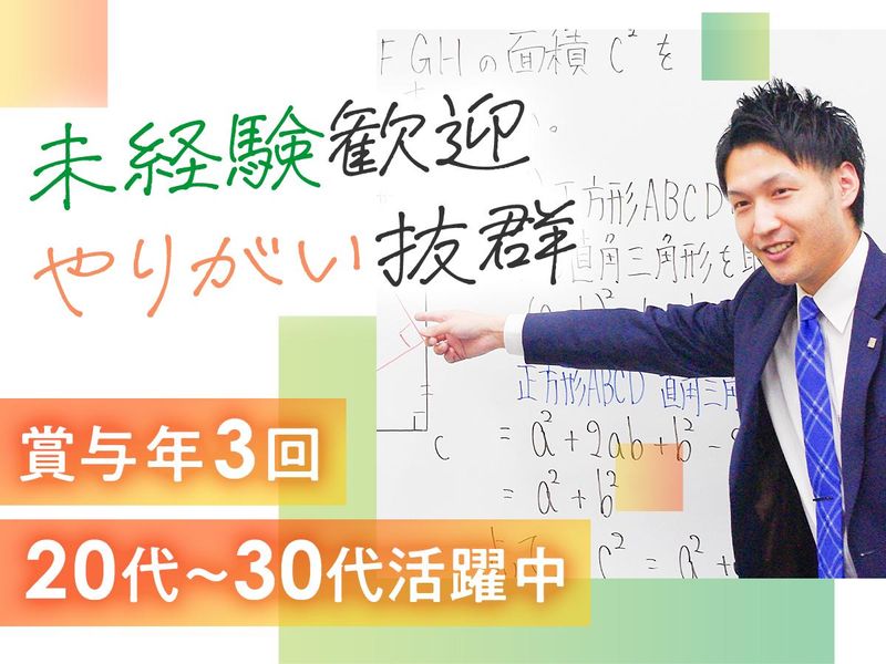 仕事内容 未経験者歓迎!未経験から活躍しているスタッフ多数。 将来の「スクールマネージャー」として 教室運営に関わる業務をお任せします。 ※ご担当頂くのは1教室のみ ↓まずは出来ることからスタート↓ ◆体験教室に来た保護者や生徒さんへの営業活動 (動画教材や教室の案内など) ◆生徒さんの受講管理や進路相談 (学習状況に合せてアドバイス) ◆保護者への対応 (保護者会・三者面談の実施) ◆売上UPにつながる企画の立案・展開 (各教室の先生もフォローします) ◆生徒募集のための広報活動 ◆アルバイトスタッフの管理 ◆他、資料作成などの事務作業 集団または個別授業部門を 担当もお願いします。 <信頼を築いていく!> ノルマなど数字に追われることもないので 目の前にいる生徒さんとしっかり向き合って 一人ひとりにアドバイスをお願いします。 商品を売るために奮闘したり、 数字を上げることにこだわることもありません。 まずは生徒さん、保護者との信頼関係を 築いていくことに集中しましょう! <こんな先輩が活躍中!> 全く新しい環境で今度はマネジメントにも 挑戦したいという思いで転職してきました。 人と接する仕事でマネジメントとしての スキルも高めながら活躍しています!