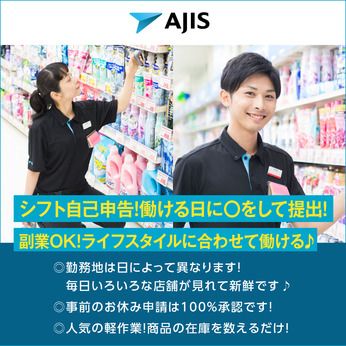 仕事内容 コンビニエンスストアで商品の在庫を数えるお仕事です。チーム制×個人作業の良いとこ取り♪ 数名のチームを組み、1店舗を担当します。 専用マシンで『ピッ』と商品のバーコードを読み取り、商品の数を入力→完了♪そんな簡単なお仕事です! チームで協力しながら集中して取り組んでください。 慣れてくればサクサクッと進められる作業です! 作業中は1人で黙々と・・・あっという間に時間が過ぎている感覚ですよ! 直行直帰OKのお仕事。身近なコンビニが勤務地となります。 対象店舗は事前に相談して決めますので、安心してくださいね! 自宅近くで働きたい方も、少し離れた店舗でお仕事したい方も相談可能です。 普段お出かけしない場所でのお仕事は「変化」を楽しみたい方にぴったり。 お仕事終了後には、勤務地近くのお店で買い物・食事を楽しむなんてことも! 希望制の自由シフトが嬉しい!事前に申請したお休みの希望は100%叶います! 働ける日をカレンダーに”マル”するだけでOK! 自己申告制シフトで融通もバッチリ♪ 「急に予定が出来ちゃった…」そんな時は気軽に相談して下さいね! 予定に合わせてシフトが組めるから「働きやすい」と大好評★ リピーターも多い人気のお仕事です♪ こんなあなたにピッタリ♪ コツコツと自分のペースで、体を動かしながら出来るお仕事です。 ドラッグストア・スーパー等での品出し・仕分け作業や、 レジ・接客業務などの経験者の方も多数活躍しています。 ダブルワークや短期間の希望者も、長期で頑張ってくれていますよ。