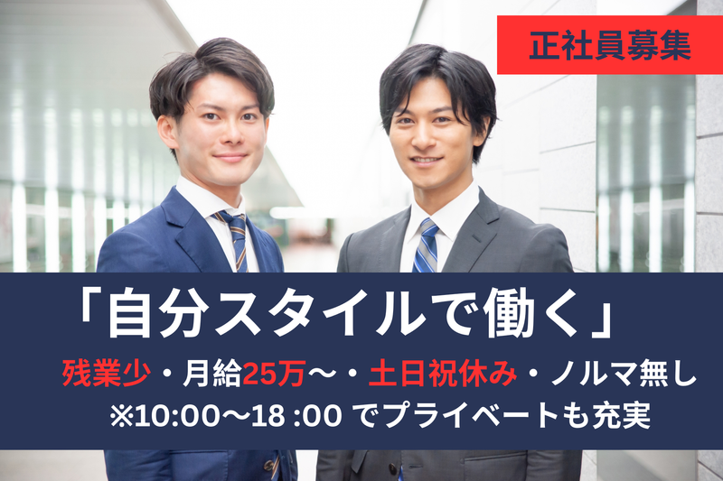 仕事内容 ✅既存顧客中心で取り組みやすい ✅研修とOJTで着実に習得できる ✅残業少なくメリハリある働き方 ✅早期昇格制度で成長スピード加速 ☆・。:・+――――――――――――― 当社と既に取引のある法人のお客様へ、 課題整理から企画提案、 販売スタッフ育成、 定期フォローまでを行う ソリューション営業です。 店舗や現場の状況を見て、 スタッフの動きや売上データをもとに 改善案をまとめ、実行まで伴走します。 新規開拓よりも継続的な店舗支援が中心。 関係づくりと現場ディレクションの 両方を経験できます。 提案内容がスタッフの成長や売上に直結し 成果を実感しやすい仕事です。 ―――――――――――――+・:。・☆ ✅具体的には…  ̄ ̄V ̄ ̄ ̄ ̄ ̄ ■店舗や現場の課題ヒアリング・整理 ■サービス・企画の改善提案 ■販売スタッフの育成・ロールプレイ ■売上管理・数値チェック ■担当店舗の定期フォロー ━━━━━━━━━━━━━━━━━━ ⭐明確なキャリアパスと昇格基準 ━━━━━━━━━━━━━━━━━━ 一般→チーフ→リーダー →グループリーダー →マネージャー →シニアマネージャーと、 役職の階段が細かく設定されており、 どの段階で何が求められるかが 分かりやすい仕組みです。 実際に20代でシニアマネージャーへ 昇格した例もあり、 成果が役職にしっかり反映されます。 若手でも昇格のチャンスを掴みやすく、 自分の頑張りがきちんと評価される環境です。 ━━━━━━━━━━━━━━━━━━ ⭐1~3週間の研修+OJTで安心スタート ━━━━━━━━━━━━━━━━━━ 入社後はまず1週間の座学研修で、 業界知識・商材理解・業務フローを習得。 その後、1~2週間のOJTで現場に同行し、 課題の見方や提案の組み立て方、 スタッフ育成のポイントを 先輩が実例を交えて伝えていきます。 担当は最初3~5店舗から。 段階的に業務を広げていけるため、 若手でも自信が育ちやすい設計です。 ━━━━━━━━━━━━━━━━━━ ⭐既存顧客メインで提案に集中できる ━━━━━━━━━━━━━━━━━━ 訪問先は取引のある法人のお客様が中心。 関西エリアでは30~50店舗を 3名で担当する運営体制です。 課題特定→企画提案→育成→フォローと、 一連のサイクルに取り組むことで、 営業とディレクションの力を磨けます。 新規開拓に追われるのではなく、 改善提案に時間を使える点が特長です。 ━━━━━━━━━━━━━━━━━━ ⭐残業ほぼナシで仕事に集中 ━━━━━━━━━━━━━━━━━━ 実働8時間でほぼ定時退社。 訪問スケジュールは自分で調整できるため、 業務を組み立てやすく、 日中に集中して終わらせることが可能です。 仕事後にジムへ行くスタッフや、 資格勉強を続けるメンバーもおり、 オンオフの切り替えがしやすいのが魅力。 有給取得も推奨され、 連休をつくって旅行に行く社員もいます。 ━━━━━━━━━━━━━━━━━━ ⭐3部門連携で提案の質を高められる ━━━━━━━━━━━━━━━━━━ 営業窓口のセールスマーケティング部門 分析・改善を担うコンサルティング部門 販売支援のセールスオペレーション部門 3部体制で店舗を支援します。 現場に足りないものや改善の糸口を 専門部署と連携しながら進められるため、 質の高い提案を実行できます。 若手でも挑戦しやすい背景があります。 ✨先輩の声  ̄ ̄V ̄ ̄ ̄ ̄ ̄ 初日は緊張でメモを取る手が震えましたが 「まずは流れだけ見てみよう」と 先輩が同行し、会話の組み立て方まで 丁寧に示してくれました。 帰り道に「今日の良かった点」を フィードバックしてくれたおかげで、 不安よりも次の訪問が楽しみに。 こうした積み重ねが自信につながっています。