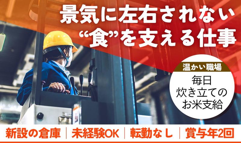 求めている人材 ★★20~30代の男性スタッフ活躍中★★ <学歴・経験は不問!> ◆未経験スタート活躍中! ◆フォークリフト免許をお持ちの方歓迎! ┗取得支援制度あり! ◆体を動かす仕事が好きな方歓迎! ※フォーク免許をお持ちで無い方も 会社全額負担で資格取得支援制度が あり安心です! <こんな方におすすめです!> ◎安定した業界で“腰を据えて働きたい”方 ◎フォークリフト免許を活かしたい方 ◎フォークリフト免許をこれから取得したい方 ◎チームワークを大切にしながら、 黙々と作業するのが好きな方 ◎体を動かす仕事が好きで、健康的に働きたい方 ◎家族や自分の時間を大切にしながら、 安定収入を得たい方 ◎あたたかい雰囲気の職場で長く働きたい方 (炊き立てごはんが待ってます♪)