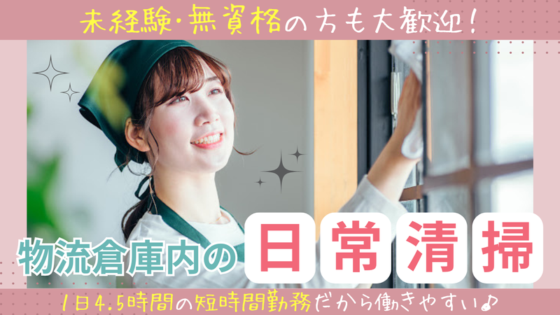 仕事内容 \\ 特別な資格・経験は一切不要! // 物流倉庫内の共用部・専有部の 日常清掃をお任せします。 お任せするのは、 倉庫内の共用部や事務所・トイレなどの清掃。 拭き掃きが中心で、 機械操作などの難しい作業はありません◎ 「家で掃除をするのが好き」 「体を動かす仕事がいい」 そんな方にピッタリのお仕事です♪ ========================= ✨未経験の方も安心して始められます!✨ ========================= 丁寧な研修があるので、未経験の方も安心。 清掃のコツや効率よく進めるポイントなど、 先輩スタッフが一つずつ教えてくれます。 最初は簡単な箇所から始め、 少しずつ慣れていけばOK! 業務はほとんどが1人作業。 「黙々と自分のペースで働きたい」 「人と話すより体を動かしている方が好き」 そんなタイプの方にもピッタリです。 ========================= ✨働きやすい環境が整っています!✨ ========================= 勤務時間は9:00~13:30の実働4.5時間。 短時間なので無理なく続けられ、 午後は自分の時間をゆっくり過ごせます。 シフトは週2日~応相談、 土日を含むローテーション制。 「家事や介護の合間に」 「他の仕事と掛け持ちで」など、 生活スタイルに合わせて働けます♪ 倉庫内は清潔で整理整頓されており、 休憩スペースもしっかり完備。 スタッフ同士の関係も穏やかで、 何かあればすぐ質問もしやすい雰囲気です。