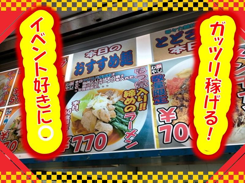 仕事内容 \ 面接⇒即採用⇒そのまま勤務◎/ Jリーグのプロサッカーチームのホームでもある、 U等々力スタジアム内の売店でのお仕事。 焼きそばや唐揚げ、たこ焼等スナック、 ドリンクなどをお客様に 接客・販売します。 賑やかな雰囲気の中で働きたい方や イベント好きな方、必見のアルバイト! ●面接後、その場で採用可否を お伝えできるので、 「今日面接でそのまま働く!」 が叶います♪