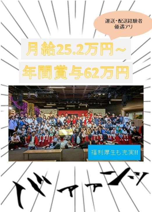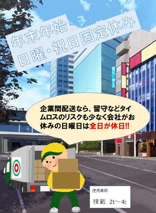 仕事内容 \\働く魅力ポイント✨// ✅未経験からスタートしたスタッフ多数 ✅20代・30代男性活躍中! ✅週休2日制でプライベートも充実◎ ✅普通免許だけでOK!資格取得支援あり ✅安定グループ基盤×分社化で任される環境 ✅拠点ごとに先輩のサポートあり/成長を後押し 福利厚生充実◎働きやすさ抜群◎ 日曜日・祝日・年末年始は必ずお休み! 土曜日は、月1回~2回程度勤務あります。 物流センターから他企業への配送を担当するドライバーの正社員募集です。 車庫や出勤場所は、2021年に完成した東京都内の新しい物流センターです。 マイカー・バイク・自転車は屋内の専用スペースに駐車可能。 配送は主に箱物の運搬が中心で、特別な技術などはいりません。 トラック免許をお持ちでない方や運転に自信がない方にも、当社が免許取得支援を行います。 <お仕事内容> 2tもしくは4tトラックにて日用品や資材などを企業間に配送するお仕事。 企業間配送だから、不在で再配達になることはありません。 <とある1日の流れ> 08:00~/積込み 09:00~/センターを出発、市川市内の納品先15~20件ほど配達 12:00~/昼食 15:00~/センターへ戻り、後片付け・翌日準備など 17:00~/業務終了! <社内イベントあり!> 納会・永遠勤続表彰・忘年会・ゲーム大会・ 花やしき貸し切りイベント・ボーリング大会など 楽しいイベントがたくさん! 親睦を深めて楽しく働けます。 <未経験スタート多数!定着率◎> 未経験からスタートした若手スタッフも多数活躍中! 普通免許さえあれば始められるドライバー。 準中型免許は会社全額負担で取得が可能です! 未経験から始めた先輩が多いから、新人へのサポートも手厚いんです◎ さらに拠点ごとに“ついて教える先輩”がいるので、ルートの回り方や積み込みのコツなどもその場で相談できます。 「まずはできる範囲から」→「少しずつ任せる範囲を広げる」流れで成長できる環境です。 <手厚い福利厚生✨賞与は年3回> 賞与の合計支給額は、昨年度で年間62万円! 本年度も同水準予定で、プライベートだけでなく収入も安定した環境です。 スタッフには安心して働いてほしいから、結婚・出産祝い金や、年間無事故手当、各種研修制度など福利厚生の整備に力を入れています。 当社はホールディングの安定基盤があり、制度面も継続的に整備・拡充しています。 一方で分社化しているため、「やってみたい」を任せてもらいやすい環境です。