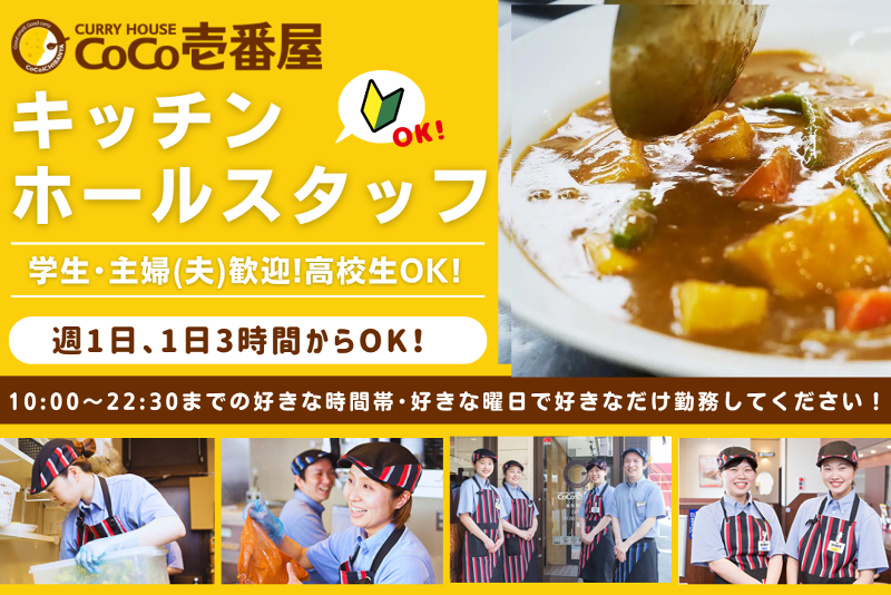 仕事内容: \週1日~・1日3時間~OK!/ 午前中~お昼の時間にサクッと勤務♪ 「家事の合間に」「空いた時間に」ピッタリ◎ 履歴書不要・まかない50%OFF◎ シフト柔軟で働きやすい環境です! -------------------------------------------------- 【仕事内容】 飲食チェーン「ココイチ」での店内業務をお願いします。 <ホール> ・注文はタッチパネル式 ・料理の提供、片付け ・レジは全自動でラクラク♪ <キッチン> ・カレーの盛り付けや調理補助 ・マニュアル完備&未経験でも安心! ※シフトに応じてホール・キッチン いずれかを担当していただきます。 --------------------------------------------------