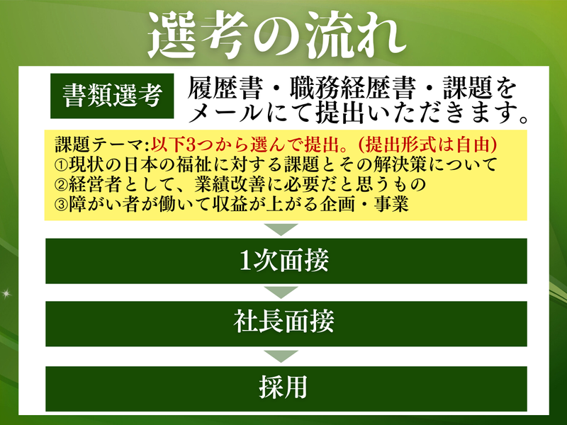 選考プロセス 文字数の都合上、選考の流れや 提出物については【仕事内容】 の欄に記載しておりますので、 そちらを確認ください。