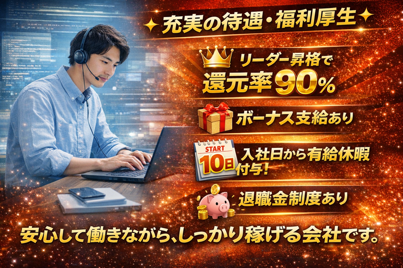 アピールポイント: 入社日に有給休暇10日付与。年間休日125日、賞与有り、退職金制度あり。経験、スキルに応じて月給を決定します。リーダー昇格後は高還元を目指せる環境です。