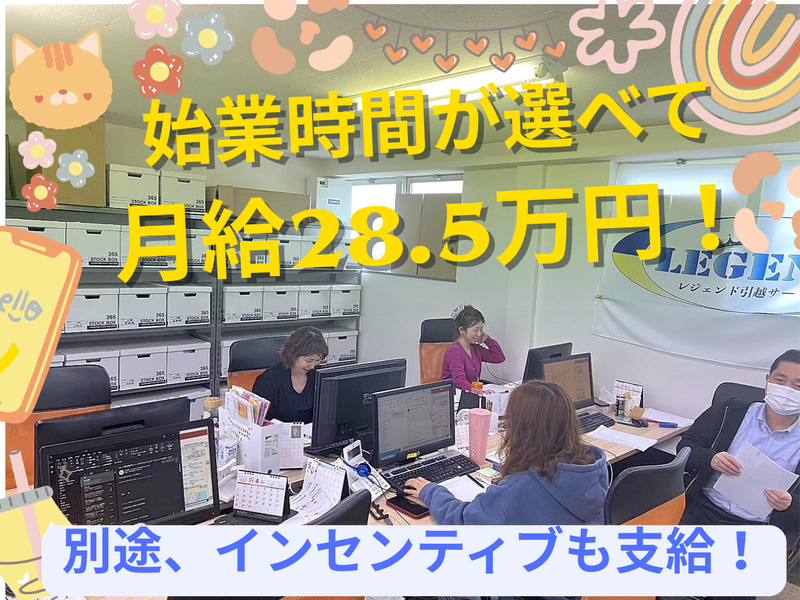 仕事内容 【年間休日105日】 【朝9時または10時のスタートが選択OK】 【新卒者や第二新卒者大歓迎!】 【ブランクのある方もOK!】 お客様に寄り添いながら、『お引越し』という新たな一歩を踏み出す ライフイベントのサポートをお願いします。 【お仕事内容】 1)引っ越しの比較サイトよりお問合せの有ったお客さまへ当社をご利用頂けるようにご連絡をします。 2)お電話で直接、いつの引っ越し予定なのかを確認し、現在のお部屋の大きさやお荷物の多さをヒアリングしていきます。 ・ヒアリングする項目の通りお話を進めていきます。 ・ヒアリング内容は、マニュアル化されていますので、ご安心ください。 ・また、お客様からのお問合せのなどにも細かくお応えしていきます。 ・当社からの質問にも丁寧にお答えいただけ、お仕事を進める上では、ストレスも感じないのも特徴です! ・ここまでは、パートスタッフの方でも行って頂ける内容なので、全く難しくなく進めて頂けます。 3)実際に具体的な内容を確認した上で、お見積書の作成を行っていきます。 ・始めは、先輩スタッフがマンツーマンでフォローを行っていきますので、少しずつ理解を深めていってください。 4)お見積書の作成が完了しましたら、お客さまにお見積書のご提示を行っていきます。 ・細かなヒアリングを行うことで、成約率も大きくアップしていきます。 5)お客さまからのご依頼が有って、書類の確認などを行い、次の工程のスタッフにバトンタッチし終了です! ・PCを使ったヒアリング入力や伝票入力などの業務も有ります。 ・入社後は、まずはスキルに応じたお仕事からお願いします。 ・伝票入力や見積書・請求書作成は、PCで専用のソフトに入力するだけでOK! だから、ワードやエクセル等のスキルがない方も大丈夫ですよ! ・まずは環境に慣れることからスタートしましょう♪ ・電話の取り次ぎ方や伝言など、少しずつステップアップしながら成長していってくださいね! 【アピールポイント】 お引越しをしたことが無い方でもスグにコツを掴んでいただける内容です。 また、お引越し経験をお持ちの方ならば、更にスムーズな対応ができるはず! どちらにしても先輩スタッフが、丁寧に基本からお教えします! (基本的にルーティンなので、スグに馴染めるはずです!)